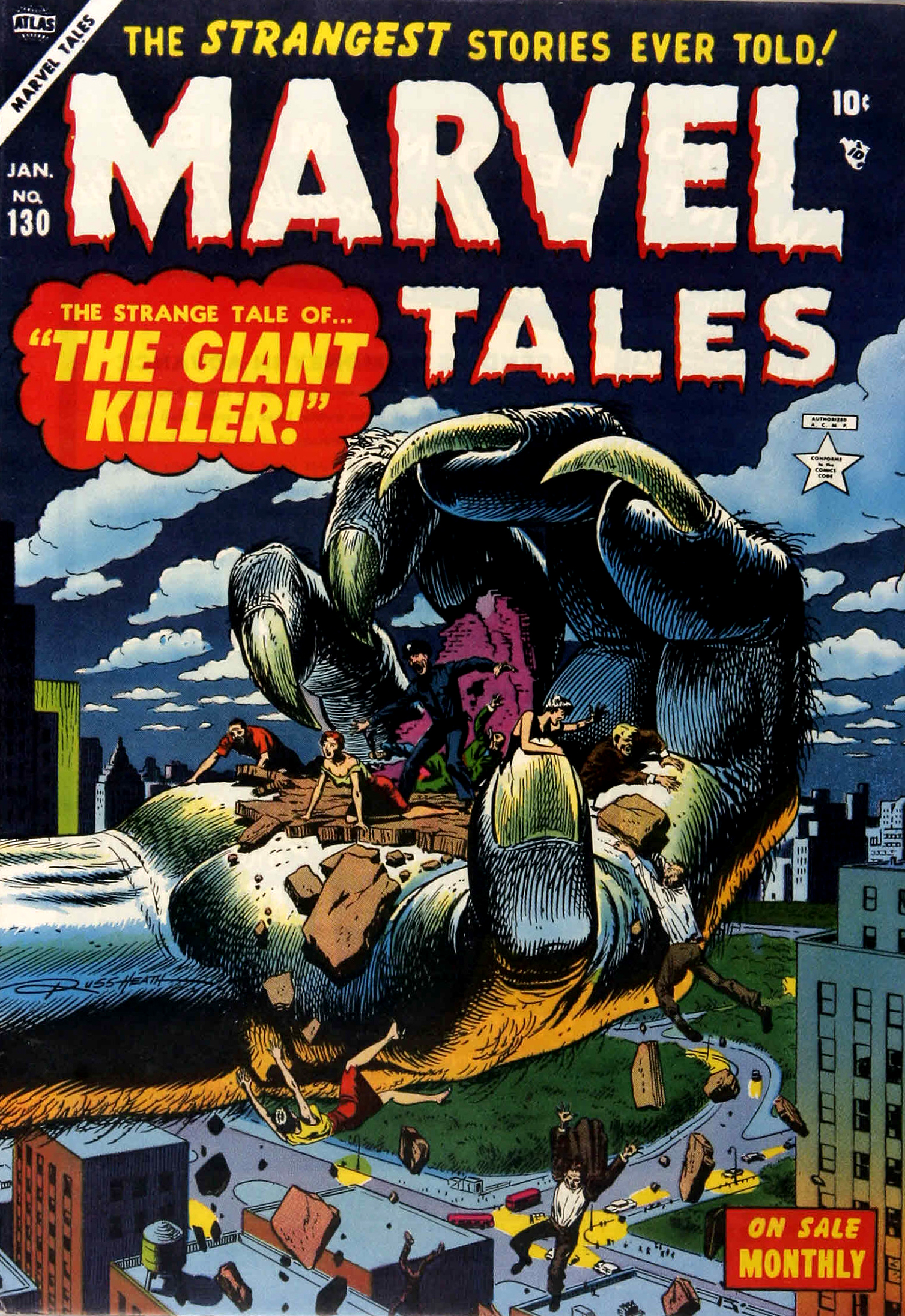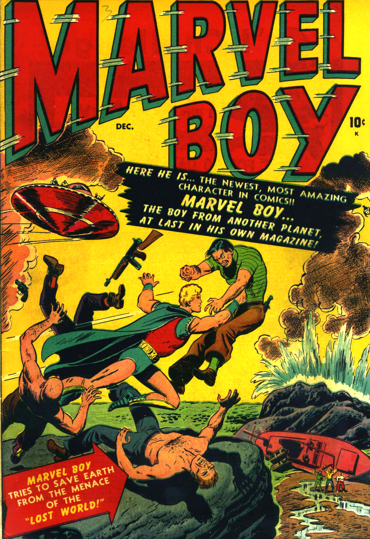 A l’époque où Heath redouble d’activité dans les comics, le genre super-héroïque est en déclin. L’artiste y touchera donc peu mais en 1950 Marvel commence à lui commander quelques récits de science-fiction pour la revue Unknow Worlds. Si bien que lorsque Marvel décide de tenter à nouveau un lancement de super-héros lorgnant sur la SF, Heath devient, avec Stan Lee, le co-créateur de l’éphémère Marvel Boy (revu récemment les Agents of Atlas). Après avoir été surtout un dessinateur de cow-boys, les sujets qu’il traite se diversifient considérablement pendant les Fifties. A partir de 1951, toujours chez Marvel, il commence aussi à goûter au récit de guerre via des titres comme War Comics ou Combat Kelly.