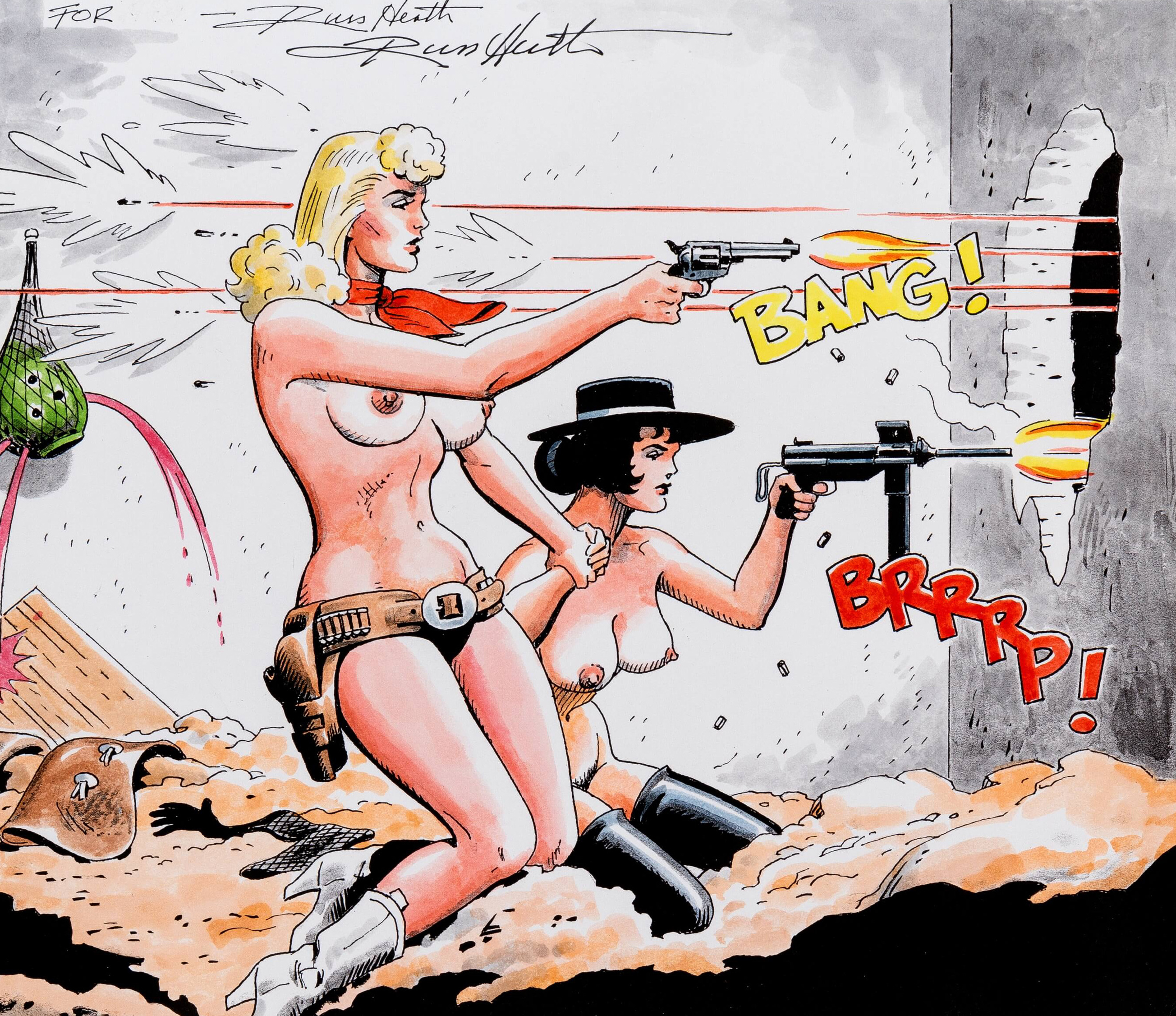 Désormais entré au panthéon des comics, Russ Heath appartient à une famille d’artistes dans laquelle on peut insérer des noms tels que Joe Kubert, John Busceman ou John Severin. Tous ont en commun une maîtrise de l’anatomie mais aussi un vrai travail des ombres. D’ailleurs on les redécouvre ces dernières années alors que leurs épisodes ressortent dans des éditions noir et blanc, qu’il s’agisse de rééditions Showcase ou Artist Editions. Mais une fois qu’on a vu le travail de Heath sans les couleurs d’époque, il est difficile de ne pas faire le rapprochement avec des artistes plus jeunes qui ont marché dans les pas de cette « famille ». Un dessin humoristique d’Heath (pour National Lampoon), « Cowgirls at War », parodie les deux piliers de sa carrière : le récit de guerre et le western. Comptons un troisième pilier si l’on prend en compte les jolies pinups. Mais quand on regarde ce dessin, on réalise aussi qu’il y a déjà des signes de ce qu’un Dave Stevens (Rocketeer) fera plus tard. Si on regarde les couvertures de Sea Devils que Heath produisait pour DC, il n’est pas incohérent de percevoir comme une antériorité sur John Cassaday (Planetary). Ce ne sont que quelques exemples de la portée d’un artiste finalement pas assez connu à sa juste valeur…