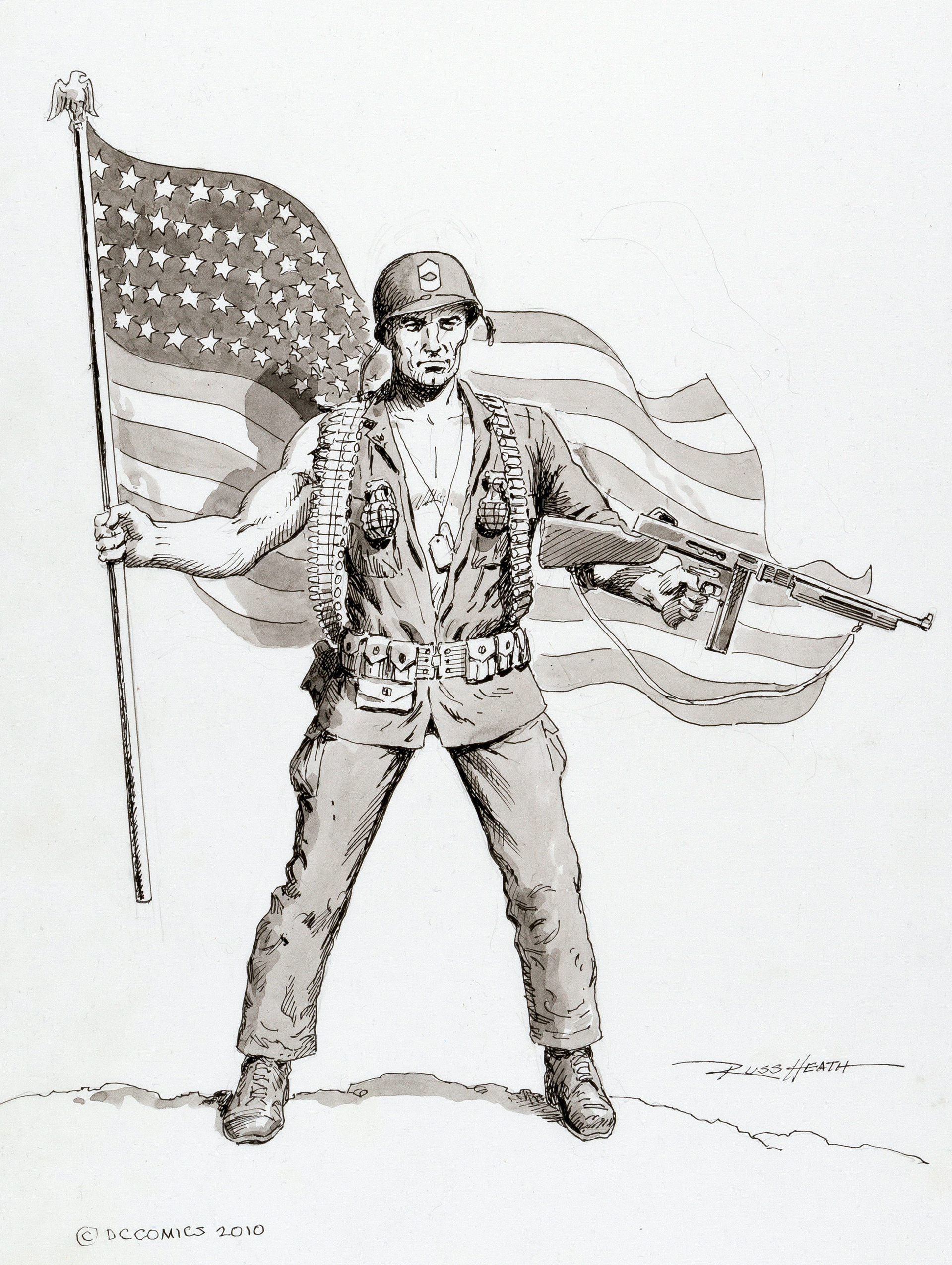 En 1955, Russ Heath dessine pour DC Comics le tout premier numéro de la série Brave & Bold. En compagnie du scénariste Ed Herron, Russ Heath y cocréé un véritable héros de péplum, le Golden Gladiator. A partir de là, si Heath est encore chez Marvel, DC Comics commence à prendre une importance de plus en plus notable dans sa production. D’autant que Marvel/Atlas connaît un certain nombre de problèmes financiers. L’éditeur baisse ses tarifs à la page, diminue le nombre de revues et de collaborateurs. A partir de 1957, avec presque dix ans de carrière régulière derrière lui, Heath devient essentiellement un artiste estampillé DC Comics. On le retrouve dans les pages d’Our Fighting Forces, Our Army at War, Star Spangled War Stories, All-American Men of War ou G.I. Combat, imposant alors l’image d’un dessinateur spécialisé dans les titres de guerre. Combats aériens, batailles navales, soldats menacés par des chars, rien ne lui résiste.