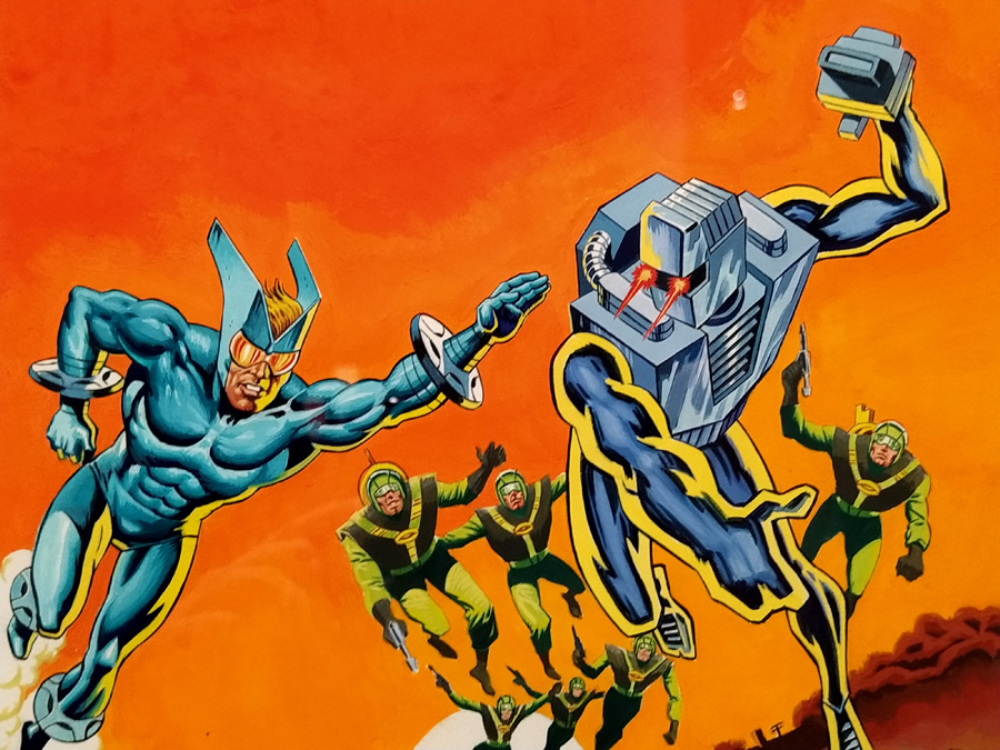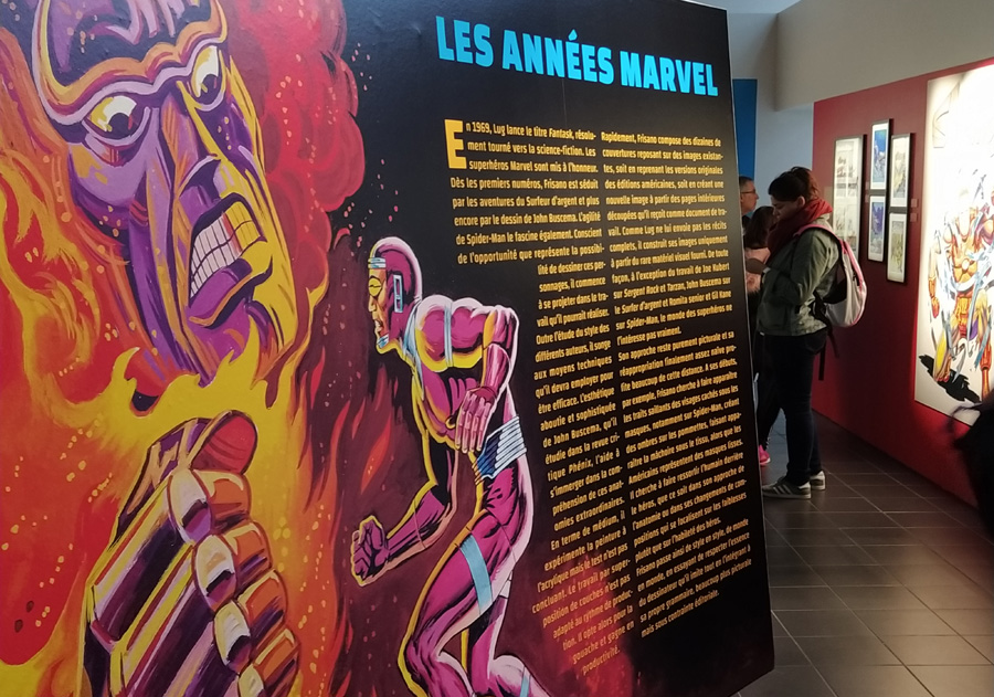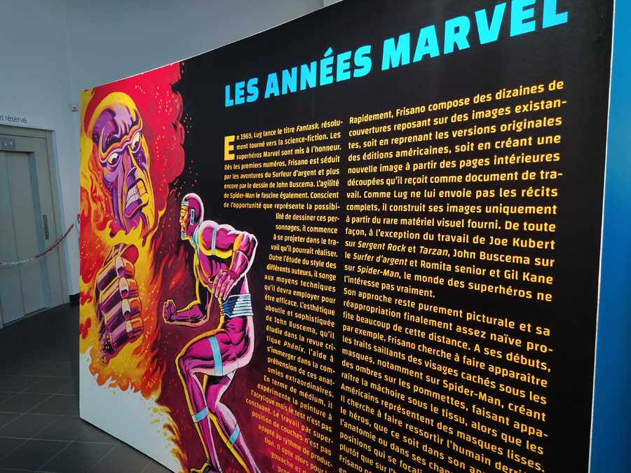 Pour toute une génération de lecteurs français de Marvel, le style Frisano est indissociable d’une certaine époque des comics. A l’époque, c’est souvent ce qui permettait de savoir immédiatement, instinctivement, si une revue était éditée par Lug, par opposition aux autres détenteurs de licences Marvel dans l’hexagone. Pas sûr du tout qu’en posant ses peintures si lumineuses Jean Frisano lui-même se soit posé la question de la postérité de ses œuvres, une fois que les numéros avaient disparus des kiosques. On a du mal à croire qu’il aurait pu imaginer être le sujet d’une exposition personnelle dans le cadre du Festival International de la Bande-Dessinée d’Angoulême. Déjà qu’à l’époque que l’intelligentzia de la Bande Dessinée méprisait allégrement la « BD de gare », la considération d’un artiste qui ne faisait « que » les couvertures ne risquait guère de l’emmener bien loin. La considération de Frisano ? elle est venue des lecteurs, pour qui ses peintures sont devenues comme une énorme madeleine de Proust. Frisano n’était pas « que » le peintre des couverture, il était l’auteur d’une véritable signalétique, d’un état d’esprit.