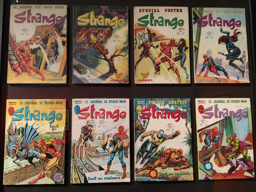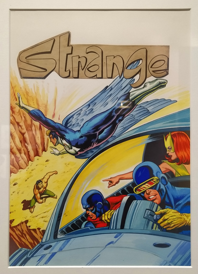 La magie des couvertures de Frisano ne tient pas en une sorte d’invention de l’illustration peinte, mais bien dans une sorte de rencontre collective, confrontant les aspirations artistiques du peintre, les impératifs éditoriaux de Lug et le matériel d’origine, avec des personnages beaucoup plus colorés que ce qu’on lui demandait pour des récits de western ou de guerre. On peut tenter de dire que les revues Marvel se sont vendues seulement à cause de leur couverture. Mais ce n’est pas tout à fait comme si les médias s’étaient précipités pour mettre à la une ses couvertures de Planètes des Singes. Non. Personne ne s’y trompe. Ce que le public préfère, c’est la rencontre des Frisano (Thomas, le fils, est lui aussi mentionné dans l’exposition, faisant doublement mentir nos visiteurs comiques convaincus que les noms ont été effacés) avec Spider-Man et les autres ressortissants de l’univers Marvel. Peut-être d’ailleurs parce que les personnages sont connus et qu’il est ainsi plus facile de voir ce que Frisano prend la peine de souligner, dans des originaux qui n’ont rien perdu de leur éclat. Une rencontre qui a de la patine, qui parfois réserve quelques surprises. A l’occasion le peintre greffe quelques détails d’un personnage sur un autre, comme Angel affublé d’un masque-visière qui semble appartenir au Mimic ou « Strange Girl » affublée d’une épaulette qu’elle n’a jamais possédé dans les comics.