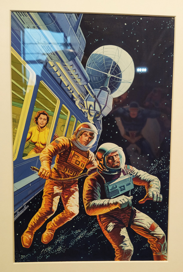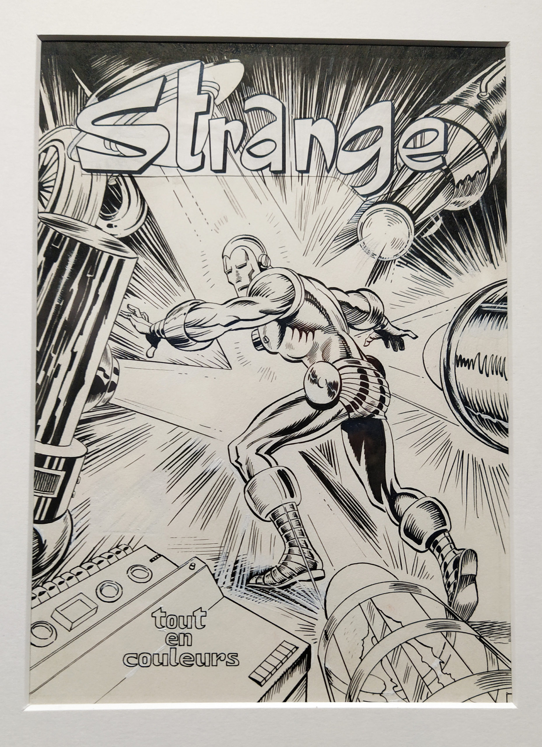 Bien sûr, pour une lectrice ou un lecteur de longue date, il est difficile de s’engager dans cette expo sans tiquer deux ou trois fois pour des raisons qui n’ont rien à voir avec les pigments. Tiens, voilà la couverture du deuxième ou troisième Strange que l’on a lu. Tiens, voilà l’original du Nova qu’on avait acheté en telle année. C’est le poids de la nostalgie. On peut aussi rire sous cape (c’est le cas de le dire) de quelques convaincus d’une conspiration (le couple mentionné plus haut), affirmant maladroitement que Frisano était tout simplement trop bon pour être une seule personne. Mais ce genre d’exposition vaut qu’on en fasse quelques fois le tour, histoire de ne pas simplement se revisiter soi-même, ne pas rester empêtré dans ses souvenirs de 12 ans. Car l’important n’est la perception que l’on a pu en avoir quelques décennies auparavant (sinon il suffirait de rester chez soi à reregarder ses Strange). C’est là aussi une affaire de rencontre. Derrière la peinture il y a l’homme. Sous cet angle-là les commissaires d’exposition ont eu une riche idée de disposer quelques photos obtenues par la famille. Frisano était un homme, un artisan travaillant sur sa planche à dessin sans se demander combien de temps ses gouaches dureraient. Cela le rend encore plus génial et attachant.