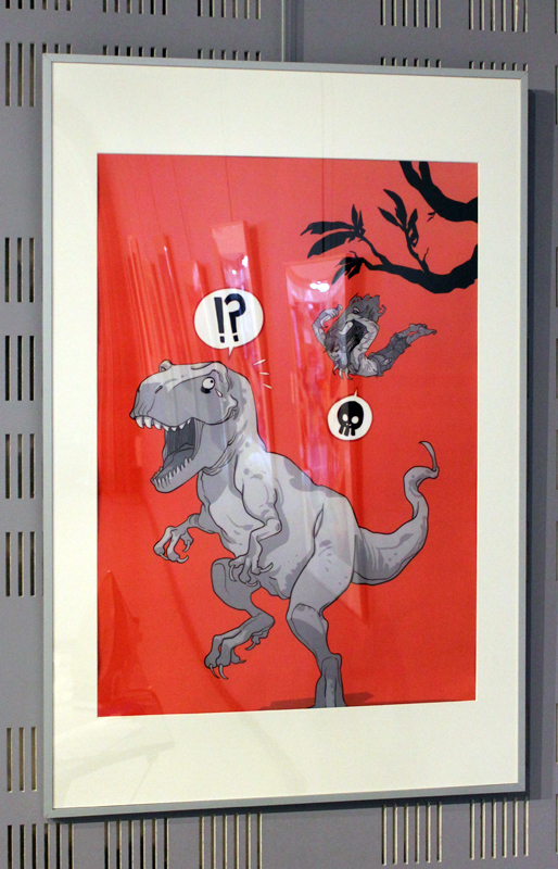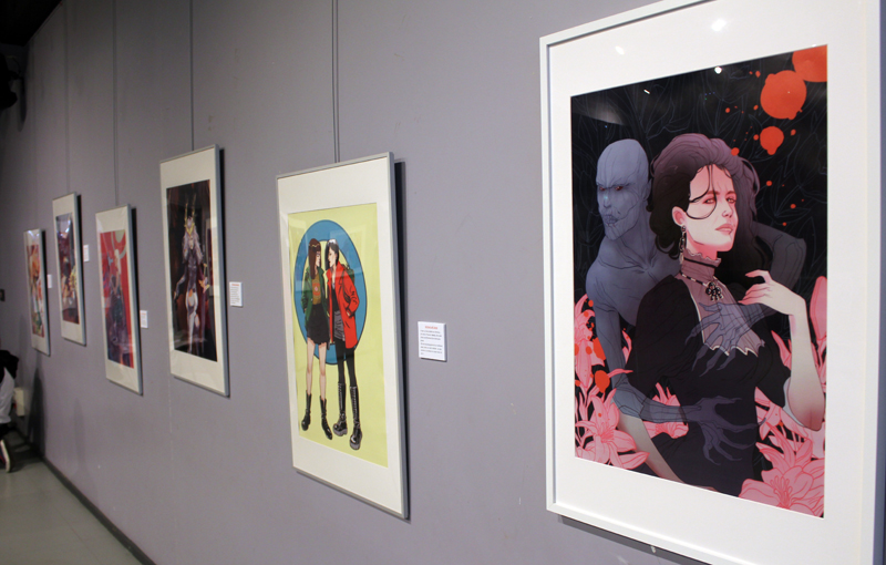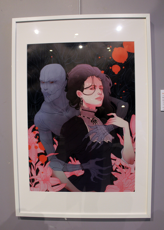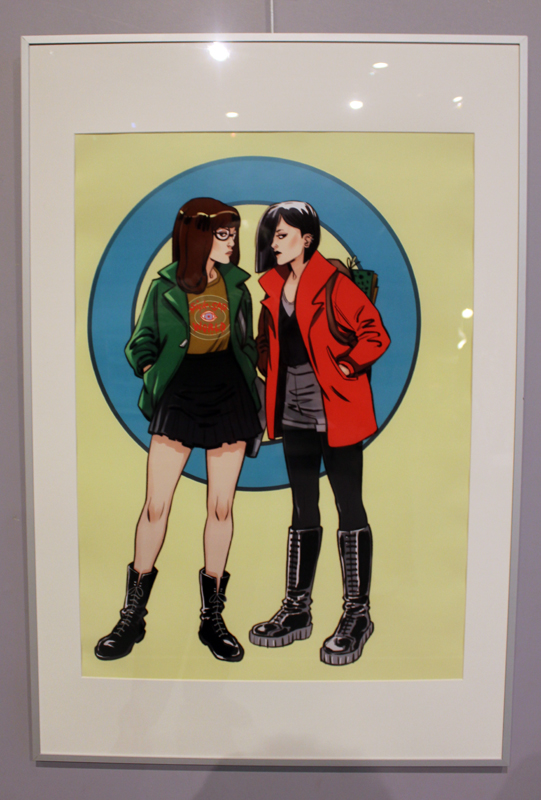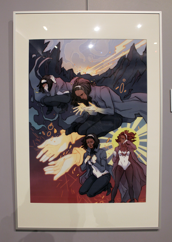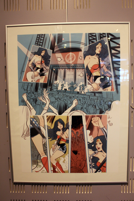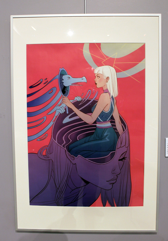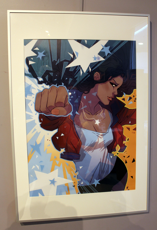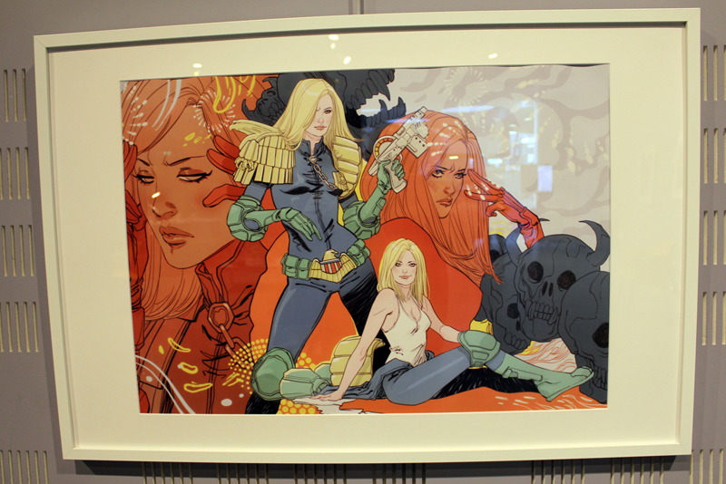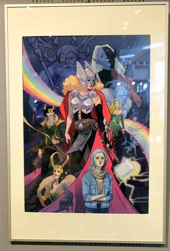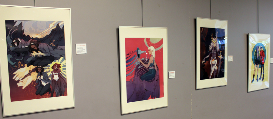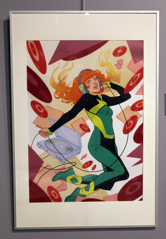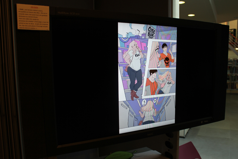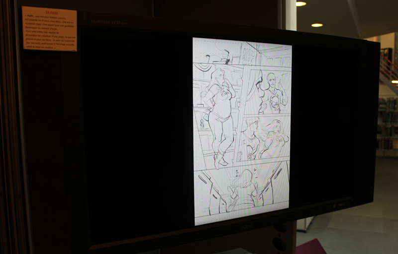 Française mais québecoise d’adoption, Marguerite Sauvage a joué le jeu en sélectionnant principalement des illustrations qui mettent à l’honneur des héroïnes de la BD américaine et même anglaise. Ainsi on retrouve fort logiquement Wonder Woman, Thor dans sa version féminine mais aussi la télépathe Juge Anderson (échappée des pages de Juge Dredd), Moon Girl, Jean Grey ou encore Vanessa Ives (Eva Green dans Penny Dreadful). Si Faith (l’héroïne de Valiant) n’apparaît pas dans les images accrochées aux murs, alors qu’elle et Marguerite sont pourtant bien associées dans l’esprit des lecteurs, c’est que le personnage a droit à un traitement spécial, juste à côté, une animation sur écran permet de montrer aux visiteurs de la médiathèque comment l’artiste conçoit une page de Faith, partant des crayonnés pour aller jusqu’à la version finale. A noter qu’à l’occasion de l’expo, la médiathèque a édité un petit badge collector, reprenant le personnage inédit que Marguerite a créé pour l’affiche de l’évènement.