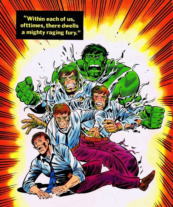 Le monochrome pourpre du costume de Daredevil devra attendre un peu pour s’afficher ; le super-héroïsme tragico-lyrique de Silver Surfer, personnage tout d’abord secondaire, s’installera petit à petit ; la logorrhée à l’humour potache de Spider-Man, durant ses combats, ne se déversera pas avant quelques épisodes ; l’anachronisme suranné de Captain America, lui, devra être précédé par la congélation du héros avant de le caractériser ; quant aux griffes notoirement rétractiles de Wolverine, elles ne sont, lors de l’apparition du personnage, qu’un accessoire de son costume. HULK n’échappe pas à cette règle. Le monstre vert (gris dans un premier temps), est foncièrement méchant et, surtout, c’est à la tombée de la nuit que Banner se transforme. On connaît déjà ces caractéristiques qui font du nouveau protagoniste Marvel une sorte de croisement entre Jekyll et Hyde, la créature de Frankenstein et le Loup Garou. Mais bientôt, la spécificité de HULK émerge : c’est la colère qui sera le déclencheur de la transformation de Banner. Et c’est le retour au calme qui induira la métamorphose inverse.