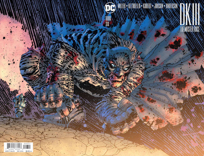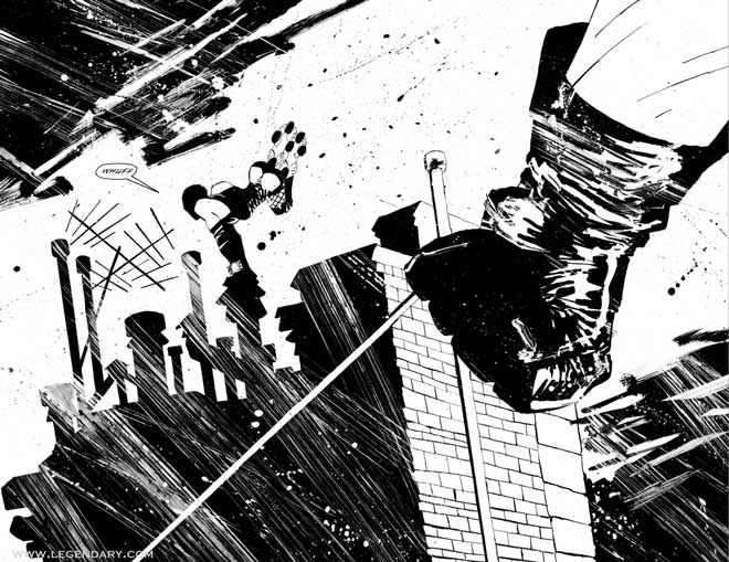 On sait que Frank Miller, débarquant sur Daredevil, va révolutionner la narration séquentielle du genre ; il va aussi y injecter du polar, de la culture nippone, ou encore de la dystopie avec son Batman. Mais allons voir directement ses travaux les plus récents. Ce qui frappe immédiatement à la vue des planches de Holy Terror ou de celles qu’il va réaliser et encrer pour The Dark Knight III : The Master Race (ainsi que les couvertures variantes), c’est la débauche de taches, de projections, de coulures d’encre, techniques qui renvoient au « dripping » et au « pouring » de Jackson Pollock (le peintre n’a pas conçu cette méthode mais il l’a massivement utilisée au point qu’elle est couramment associée à son œuvre). Miller bombarde sa feuille de dessin, il la gratte, il y colle violemment des empreintes, il la balaye de gros pinceaux aux traces fulgurantes ; taches, petits points, traits dans tous les sens, giclées de noir ou de blanc, cet encrage « dirty » porte en lui l’énergie bouillonnante de la gestuelle du dessinateur. Energie encore, énergie toujours ! Mais parle-t-on de la même ?