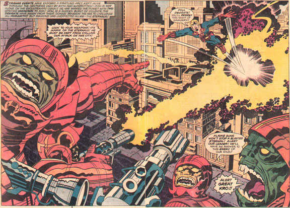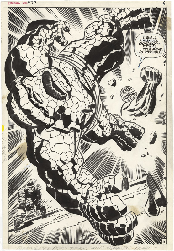 Dans la période la plus achevée de son travail, l’énergie déborde des pages de Jack Kirby. Les postures des personnages, d’abord ; ils sont continûment comme des ressors tendus, dans la moindre des situations. Faut-il ramasser un stylo tombé au sol ? L’attitude du protagoniste sera celle d’un adepte du plongeon sportif prêt à bondir de son tremplin. Les armes ou les machines, ensuite ; d’une esthétique reconnaissable, elles tirent des rayons tout aussi singuliers, bourrés de petits cercles noirs dont émanent une intensité rare et palpable. Les coups dans les combats au corps à corps, enfin (et surtout !) ; Les traits d’énergie qu’ils libèrent envahissent tout le décor, allant parfois jusqu’à masquer une partie des héros eux-mêmes. C’est là que le King va le plus loin, au point que ses confrères, y-compris lorsqu’ils reprennent des séries qu’il a marquées de son empreinte (John Buscema sur Fantastic Four par exemple), n’osent pas reprendre le motif avec le même degré d’ostentation. Notons cependant que le trait, du crayon ou du pinceau, est quant à lui assuré, maîtrisé, contrôlé avec une application qu’on peut associer à la calligraphie. Il en va autrement dans le travail d’un autre artiste pour qui la « force en action » est également primordiale.