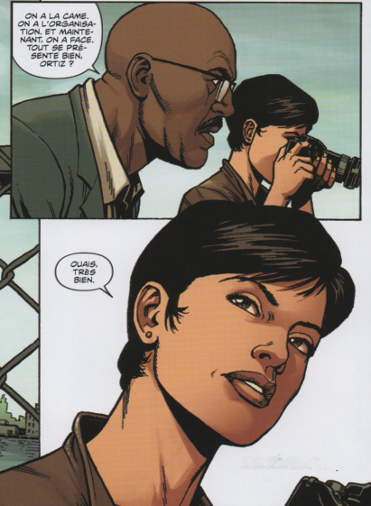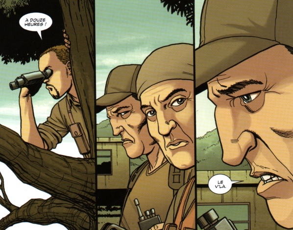 Survolant les mises en pages de Dillon – nous nous intéresserons surtout à « Punisher, Opération Condor », scénarisé par Becky Cloonan, dans lequel son art semble parvenir à une pleine maturité -, on pourrait rapprocher spontanément son travail de celui d’Enki Bilal (pour l’école de Paris), tant la prédominance des plans rapprochés (taille ou poitrine) et surtout des gros plans, chez les deux artistes, focalisent l’attention du lecteur sur les visages. Comme chez Bilal encore, la récurrence (et la précision anatomique) des ¾ face, ainsi que la quasi absence d’ombrage (l’accent, pour l’essentiel, est mis sur le trait), semblent faire de ces visages la cible prioritaire de sa mise en scène. Pourtant, du point de vue adopté par Frank Miller, les deux dessinateurs sont à l’opposé l’un de l’autre. Allons voir de plus près et nous remarquerons que chez le français, les protagonistes, à l’instar d’un Buster Keaton par exemple, affichent en effet une absence d’expression presque constante et, quand expression il y a, elle est timide, à peine esquissée, implicite quasiment. Chez le britannique au contraire, plus proche en cela d’un Charlie Chaplin, les expressions sont nombreuses, ultimes et nuancées à la fois. Là où chez Bilal, c’est le contexte des images et le texte du récit qui vont suggérer les émotions et les sentiments de ses sobres « acteurs », l’éloquence outrancière et la tonalité précise des mimiques faciales, chez les « comédiens » expressionnistes de Dillon, pourraient nous donner à elles seules une idée plutôt juste de l’intrigue, et ce avant même toute lecture. Si l’art de la dramaturgie consiste à construire un récit à partir d’une histoire donnée, Steve Dillon est bien ce dramaturge silencieux que nous décrit Miller – et du reste, du temps de sa collaboration avec Garth Ennis, le dessinateur avait scénarisé et illustré lui-même une histoire courte de vingt-deux planches (« Une Journée Ordinaire ») qui, se passant entièrement de tout texte, était lisible et forte pour autant. Nous pencher sur les expressions du visage humain s’impose alors.