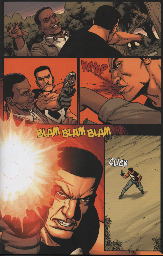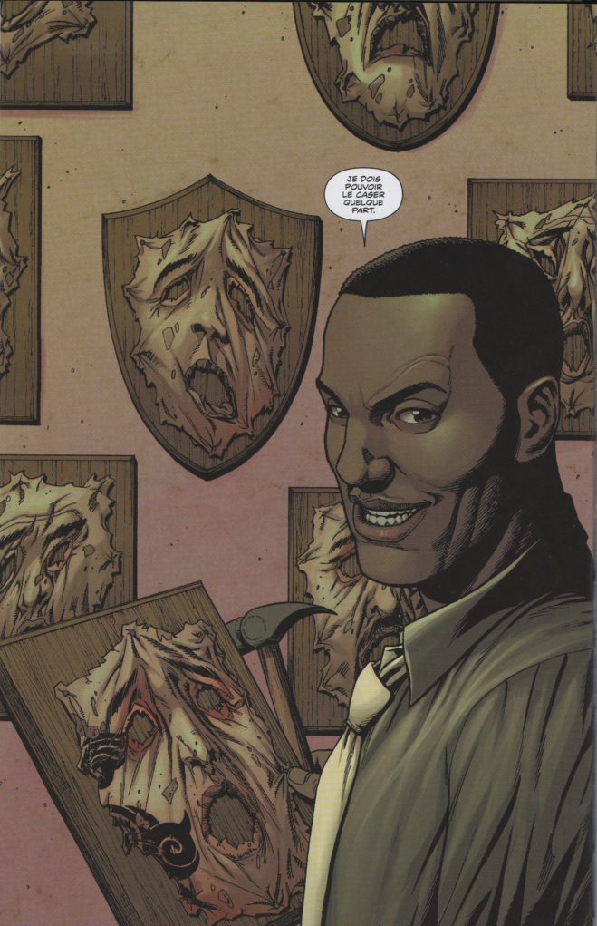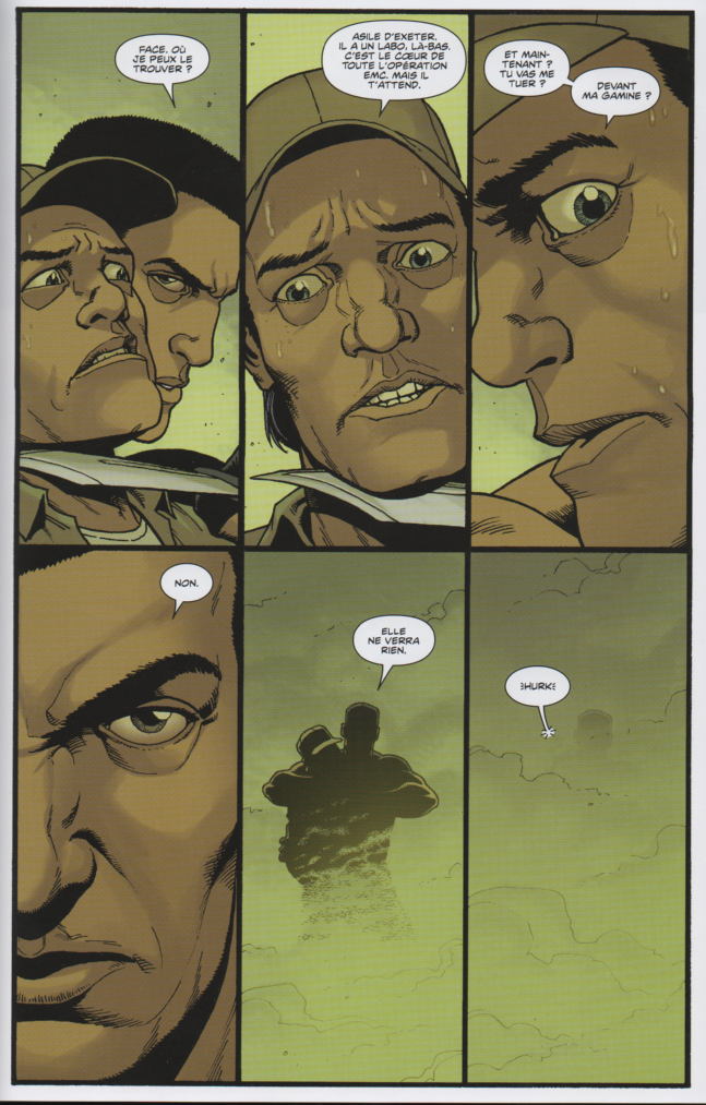 Car c’est une huitième expression que le Punisher va véhiculer sous le trait de Steve Dillon. Les sept autres ont en commun de dominer celui ou celle qui les exprime. On ne décide pas d’être joyeux, triste, en colère, dégouté, apeuré, surpris ou méprisant. Ce sont les événements qui commandent et qui imposent. Or, le Punisher, dans un regard unique et prégnant auquel participent tous les muscles faciaux, affiche tout autre chose : la résolution. Et la résolution est volontaire. On se retourne vers les événements et on tente de les faire plier. La résolution c’est le refus d’endurer et c’est la prise d’initiative. Bien sûr, le personnage, quel que soit le dessinateur, a toujours eu un côté résolu. Mais il est parfois lui aussi surpris, attristé, déprimé, autrement dit il est une proie possible de l’émotion qui le prend, du sentiment qui le domine. Chez Dillon rien de tout cela. A de très (très !) rares exceptions près, le héros à la tête de mort est constamment et délibérément volontaire, il est continûment dans le choix de ce qu’il fait et de ce qu’il a à faire. On peut lire parfois, dans sa résolution ultime, des bribes d’étonnement, des soupçons de colère ou des pincées de mépris, mais c’est bien la résolution qui domine toujours. Notons que Becky Cloonan fera dire à l’un des protagonistes de sa minisérie : « On peut pas tuer Castle… Il est déjà mort ». Entendez celui qui subit (Frank Castle) est mort, seul celui qui est dans le choix (The Punisher) est vivant. Ajoutons que le méchant de l’histoire de Becky – l’adversaire principal du Punisher dans « Opération Condor » -, est nommé « Face », et que celui-ci arrache la peau du visage de ses ennemis vaincus pour les clouer sur des trophées de bois accrochés à son mur. Clin d’œil appuyé à la quintessence de l’art de Dillon ? Rencontre inconsciente du visuel et du scénario ? Simple coïncidence ? Quoi qu’il en soit cette huitième expression est bien celle du choix, de la volonté, de la résolution, là où l’ensemble des autres personnages sont possédés, eux, par tout un panel d’émotions qui les saisit.