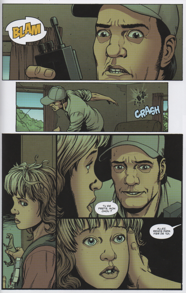 La plupart des études sur la question distinguent sept familles d’expressions – qu’il s’agisse d’émotions ou de sentiments engendrés par ces émotions. La joie, la tristesse, la colère, le dégout, la peur, la surprise et le mépris. Chacune d’elles peut bien sûr se nuancer. Ainsi, par une connaissance large et un travail méticuleux sur le jeu des muscles faciaux qui vont animer le front, les paupières, les joues, le menton, par les rapports des sourcils, de la position des pupilles et de l’ouverture de la bouche, et grâce à des tas d’autres éléments tels que les rides ou la sueur, Steve Dillon va jouer, avec l’orchestre de ses personnages, une symphonie d’expressions tout en finesse, alternant temps faibles soigneusement intelligibles et temps forts impactants et absolus. On y verra tour à tour la peur résignée, la terreur incontrôlable, la surprise inquiète, l’étonnement fasciné, la joie sadique, le ravissement naïf, la colère tremblante, la fureur jouissive, la tristesse contenue, la peine inconsolable, le mépris moqueur, l’arrogance soucieuse, le dégout sidéré ou la répulsion irrépressible, et la liste n’est pas exhaustive tant Dillon maîtrise, semble-t-il, tout le spectre des mimiques humaines. Mais il est un personnage qui manifestement n’est pas concerné par tout cet arsenal expressif là.