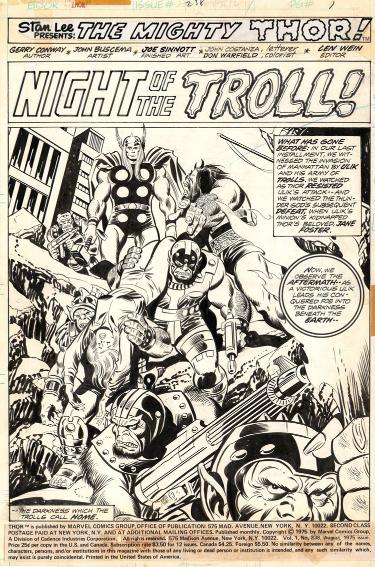 Entretemps, en 1962, Joe Sinnott a encré la première apparition du dieu Thor et reprend même pendant quelques mois le dessin de la série. Joe va aussi encrer les exploits de Nick Fury, Agent of S.H.I.E.L.D. Désormais pleinement entré dans le genre super-héroïque il devient aussi l’encreur de Gene Colan sur Captain America. Quand Jack Kirby claque la porte de Marvel, Sinnott devient garant de la continuité visuelle, reste l’encreur sur ses séries en cours. Mais Martin Goodman vend Marvel, Kirby et Ditko sont partis tandis que Stan Lee (passant de plus en plus de temps à promouvoir Marvel et de moins en moins de temps à gérer les affaires courantes) se fait rare. Ce n’est plus la « société des copains » et il est évident que dans les années 70 Joe redirige une grosse partie de ses activités sur Archie Comics (avec des séries comme Sabrina The Teen-Age Witch). On continue cependant de le retrouver dans des publications Marvel. Il est par exemple le partenaire de John Buscema lors du lancement de Ms. Marvel (future Captain Marvel) en 1977. Quand le scénariste Gerry Conway et Buscema s’en vont, Sinnott reste le seul membre de l’équipe créative originelle, continuant là aussi d’apporter une continuité visuelle.