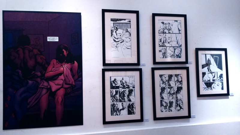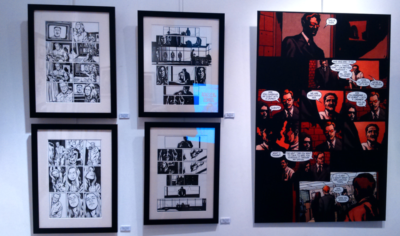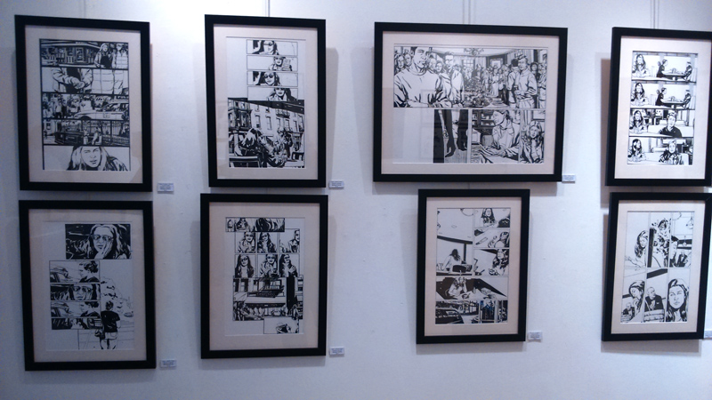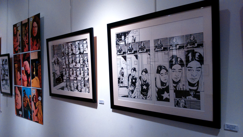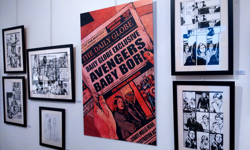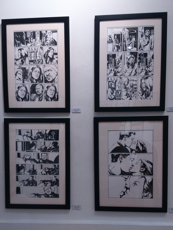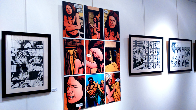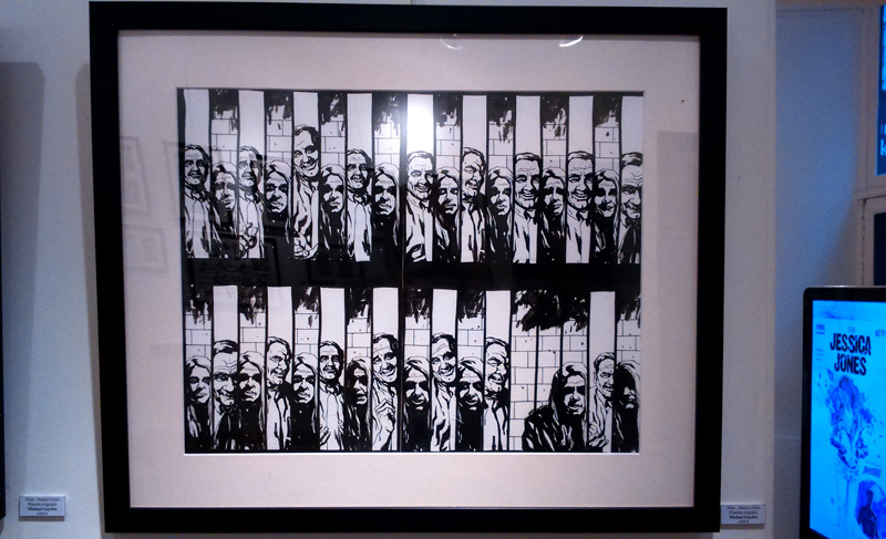 On trouve aussi quelques croquis préparatoires comme les esquisses du costume de Jewel. Bref, Gaydos est réellement dans la place, son univers graphique imprègne les murs de la galerie (petite, elle ne comporte que deux pièces, soyez prévenus) tandis qu’on ne peut que féliciter – cela vaut le coup d’insister – Arludik et Netflix de faire le choix de mettre en avant la BD d’origine plutôt que de penser coûte que coûte à caser sa série TV. Bien sûr, parler de l’un permet d’évoquer l’autre. On tend vers une symbiose. Mais par la même occasion, on peut ainsi faire découvrir aux curieux, l’œuvre d’origine, jouer l’immersion en attendant le 20 novembre (date de la diffusion de toute la première saison de la série TV). On se prend à rêver que l’initiative soit répétée pour les autres personnages à venir chez Netflix (Luke Cage, Iron Fist…).