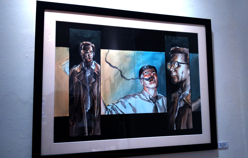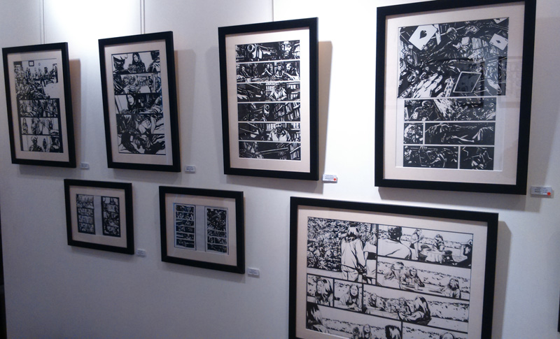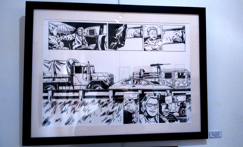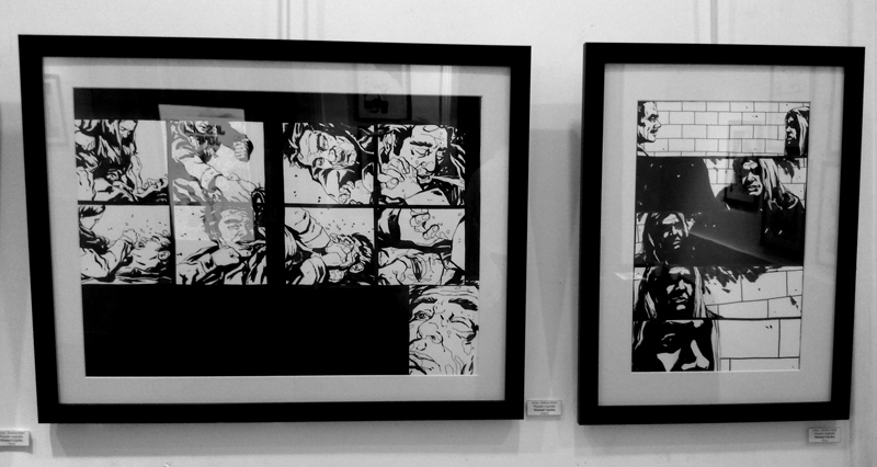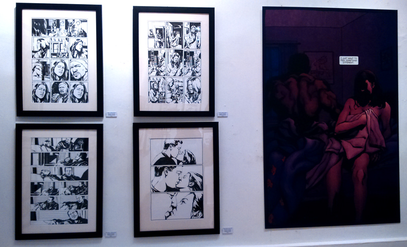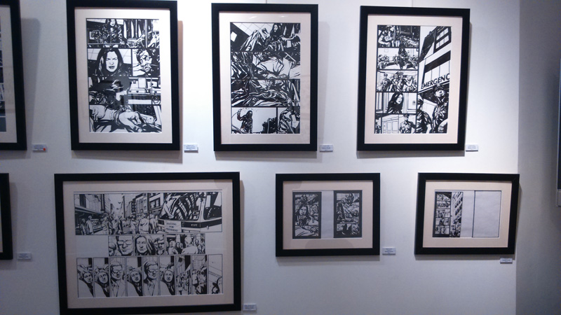 Le dessinateur, présent pour le vernissage, nous confie d’ailleurs qu’il n’est pas un habitué des galerie d’Art, la première exposition de sa carrière remontant à quelques mois en arrière. Le voici donc qui profite du buzz autour de la série pour montrer son travail. S’il y a bien quelques reproductions/agrandissements (essentiellement des copies de pages telles qu’elles ont été imprimées, pour donner du contexte à ceux qui n’ont jamais feuilleté Alias), la majeure partie des pièces permet au contraire de voir les pages de Gaydos tel qu’il les produit. On peut ainsi distinguer toutes les mi-teintes dans les zones d’ombres, qui échappent bien souvent à l’imprimeur ou qui sont trop contrastées pour que le lecteur les repère. Dans l’état, ces masses sombres permettent de ressentir le travail du dessinateur « grandeur nature ».