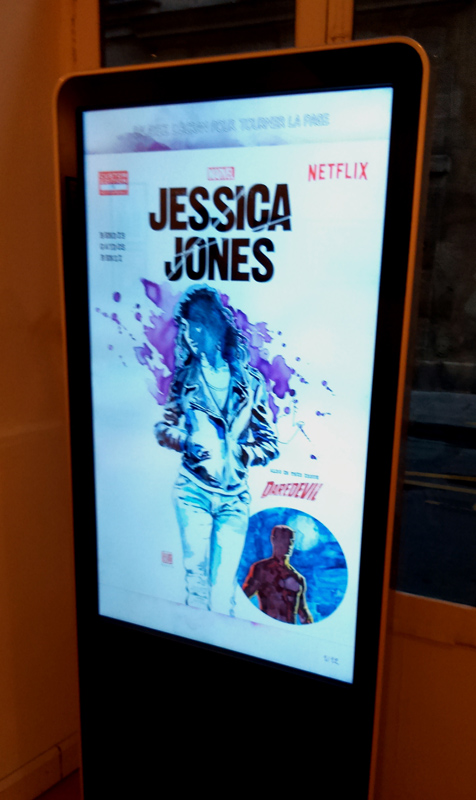 A savoir, d’abord, l’édition d’un comic-book exclusif et gratuit « Jessica Jones » réunissant les deux créateurs de l’héroïne, Brian Michael Bendis et Michael Gaydos… Et puis… Et puis il y a aussi, depuis quelques jours (et jusqu’au 2 janvier 2016), l’exposition « L’art de Marvel’s Jessica Jones » qui se tient à la galerie Arludik (12-14 Rue Saint-Louis en l’Ile 75004 Paris), en partenariat avec Netflix. Et là, on aurait pu craindre que l’allusion se réduise à des designs de pre-production. Pour certains films ou séries, on voit le travail du type qui a « inventé » le design d’une nouvelle armure ou d’une nouvelle batmobile et c’est parfois un peu difficile à avaler quand des noms d’auteurs de comics, qui ont fait le job en amont, est carrément oublié. Mais là, pas de confusion possible. C’est bien une exposition qui ne regroupe que des planches et des dessins de l’artiste Michael Gaydos que l’on nous propose. Netflix joue carrément le jeu et, s’il y a bien une borne interactive, elle permet surtout de feuilleter à volonté, sur grand écran, le comic-book récent « Jessica Jones ». Pour le reste, ce ne sont qu’originaux et croquis de Gaydos, réalisés bien souvent au moment du lancement la BD Alias ou dans des phases clés du parcours de l’héroïne.