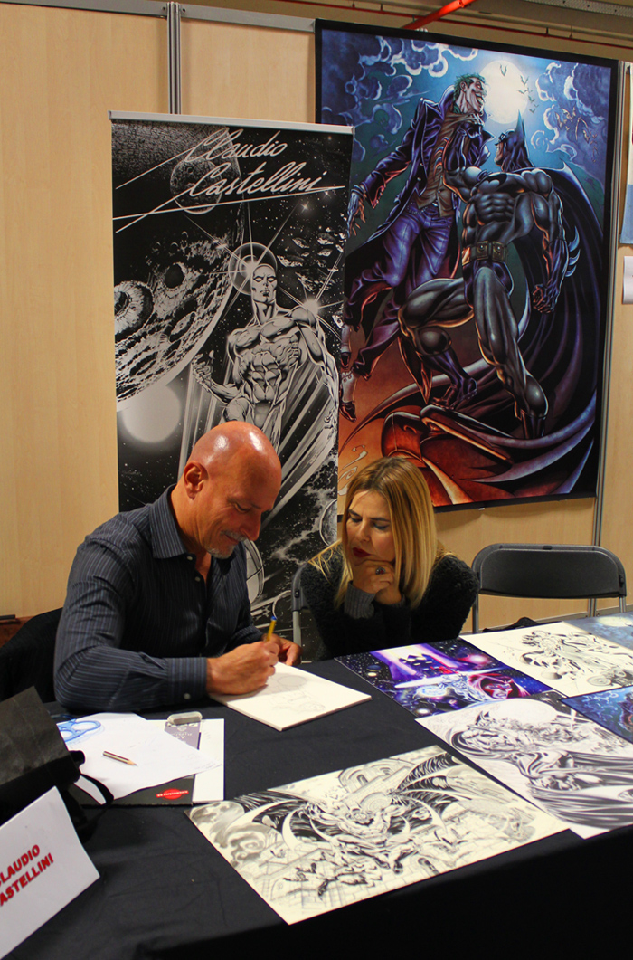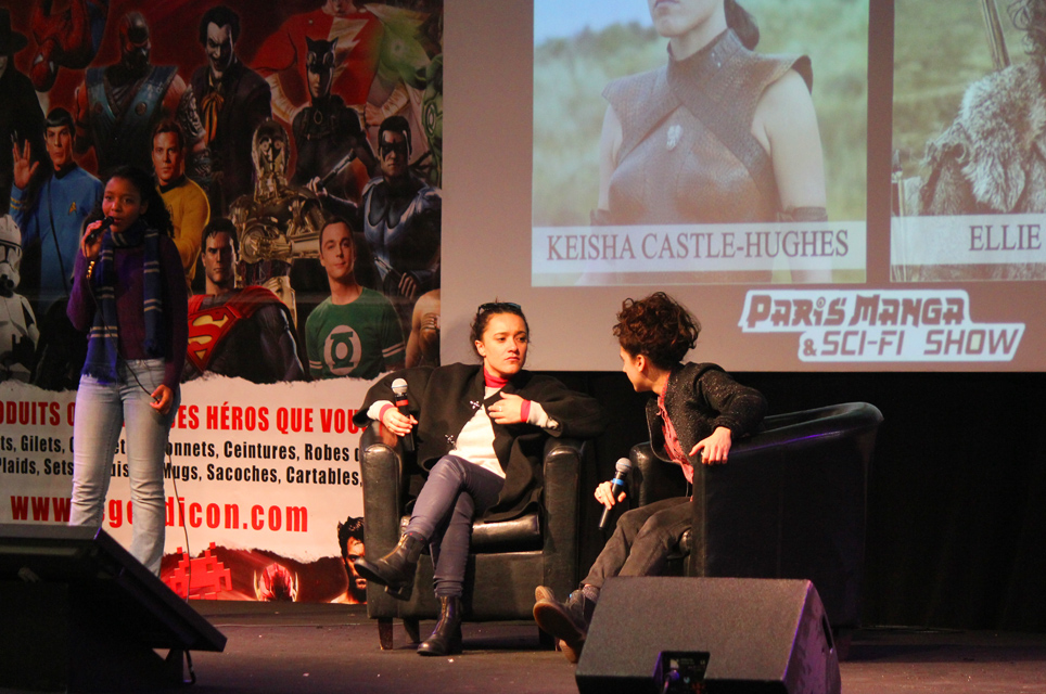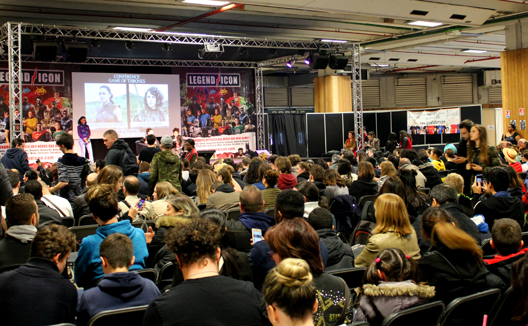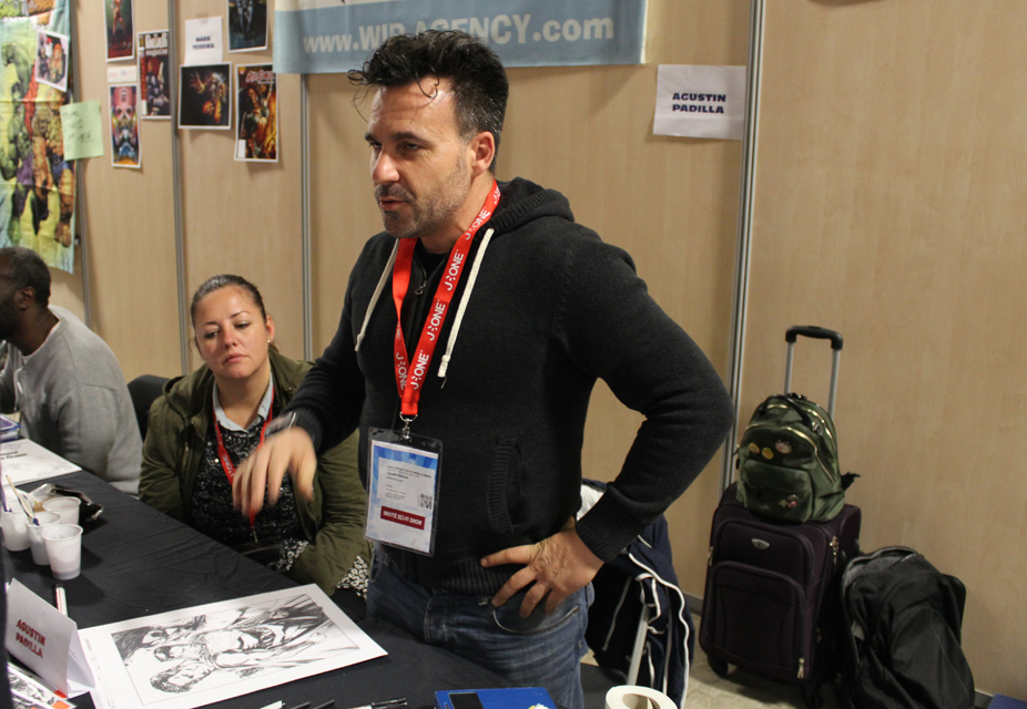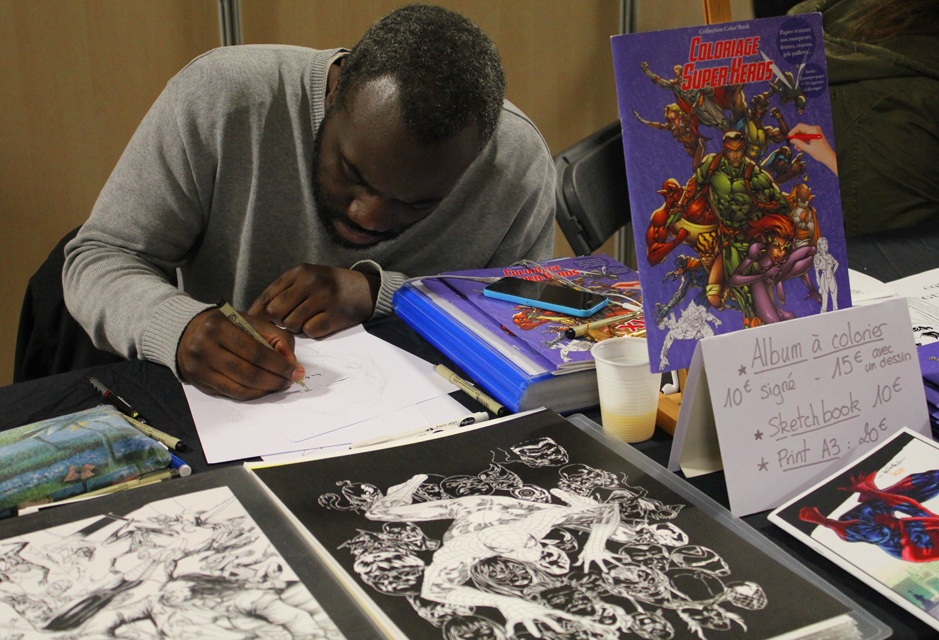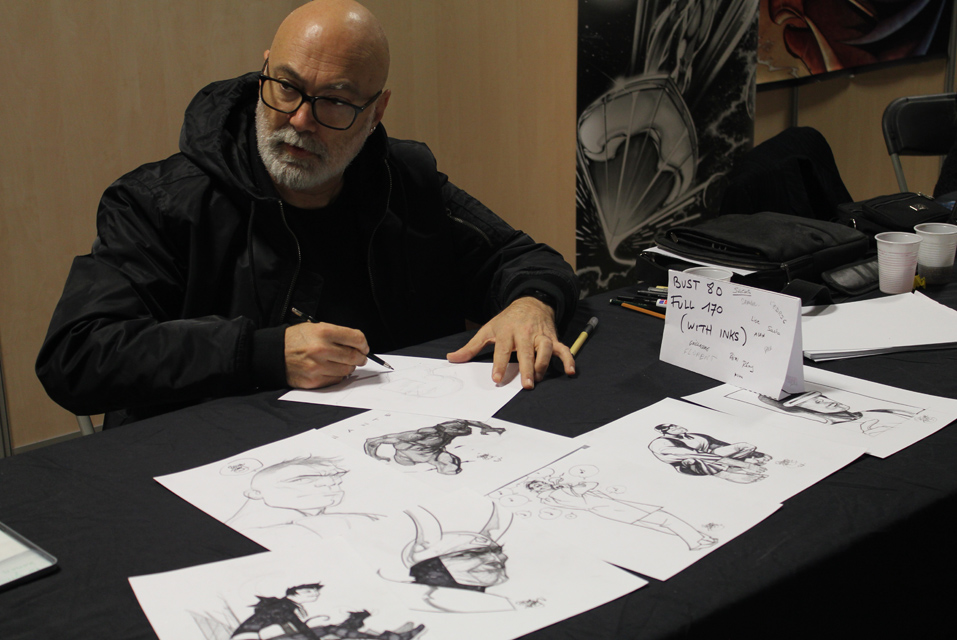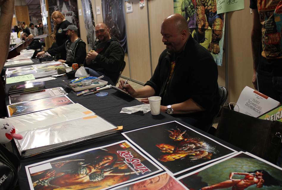 De fait, il y avait un vrai corner Game of Thrones ce week-end. Ce n’est pas la première fois que la manifestation accueille des comédiens de la série, mais ce week-end Charles Dance (le patriarche Lannister), Ellie Kendrick (Meera Reed), Keisha Castle-Hughes (Obara Sand) se prêtaient à l’exercice des photo-shootings mais aussi de quelques panels sur le déroulement de la série. L’occasion pour Ellie de glisser quelques phrases de français pour expliquer qu’elle avait été triste du sort d’Hodor. Parmi les différents acteurs présents, Christian Slater était également une sensation. Pour ce qui est d’un réel « comics corner », on pouvait trouver de nombreux artistes internationaux, qu’il s’agisse de John Bolton (hélas parti assez vite le dimanche), Claudio Castellini, Mark Texeira, Pascual Ferry, Steve Scott, Agustin Padilla ou Yildiray Cinar lequel réalisait de superbes « art commissions » (on a vu passer un Conan de toute beauté). Dans cette Artist Alley, on trouvait aussi quelques régionaux de l’étape comme Michel Borderie ou Guile Sharp, qui en profiter pour présenter son nouvel ouvrage, un livre de dessins de super-héros « à colorier » mais qu’on peut également garder sous le coude dans l’état, en noir et blanc, et qui reste superbe.