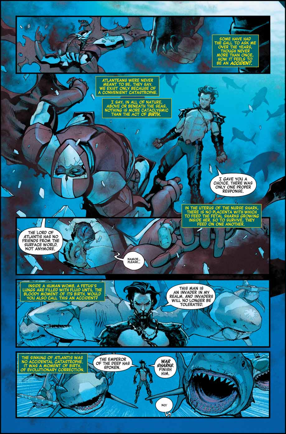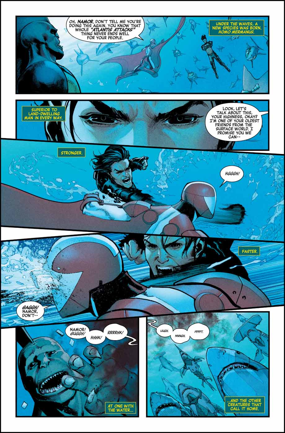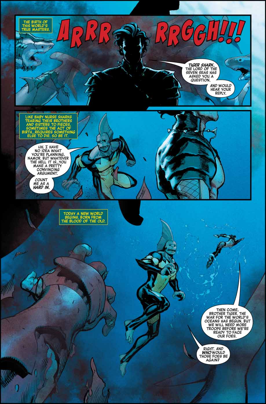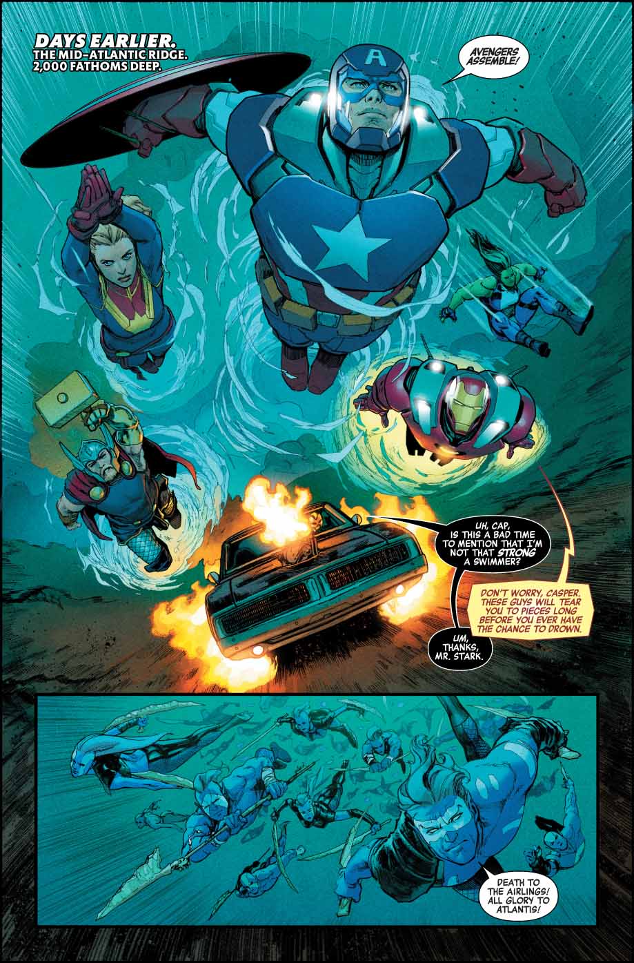 7 octobre 2018« World War Below. » With the underwater world on the brink of war, the Avengers go aquatic to save the day, but air-breathers are no longer welcome in the undersea city of Atlantis. And Namor, the Sub-Mariner, lord of the seven seas, has a bold new plan that will change the balance of power on Earth forever.