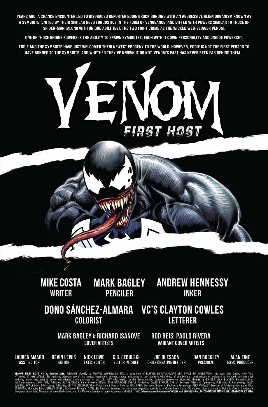 25 août 2018Before the Amazing Spider-Man… Before Venom… There was the First Host. And that First Host has returned in need of Venom’s help – only by reuniting can the two avert cosmic ruin! Can Eddie and the symbiote trust one another long enough to save the galaxy, or will the First Host prove to be Venom’s undoing?!