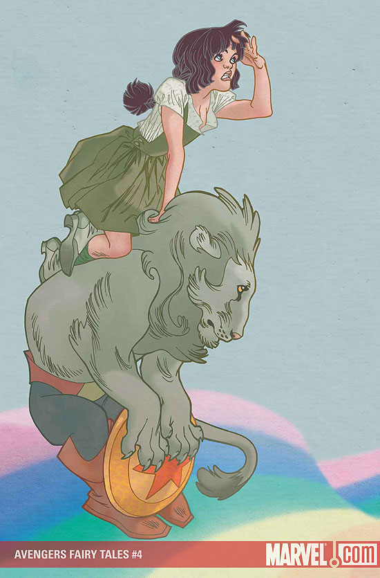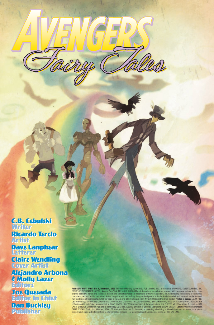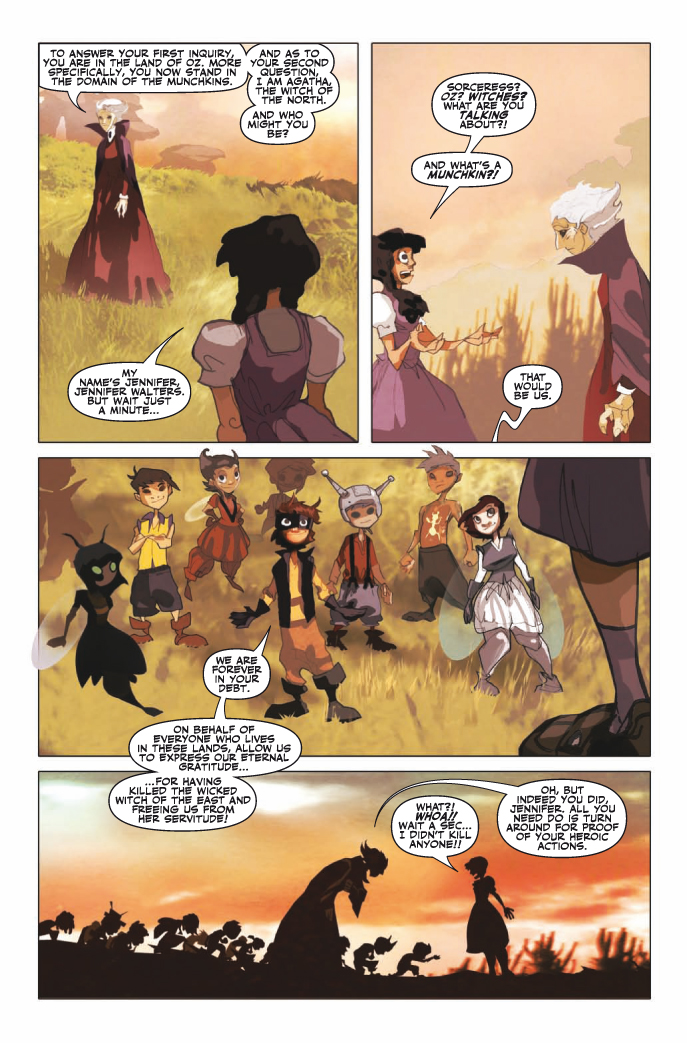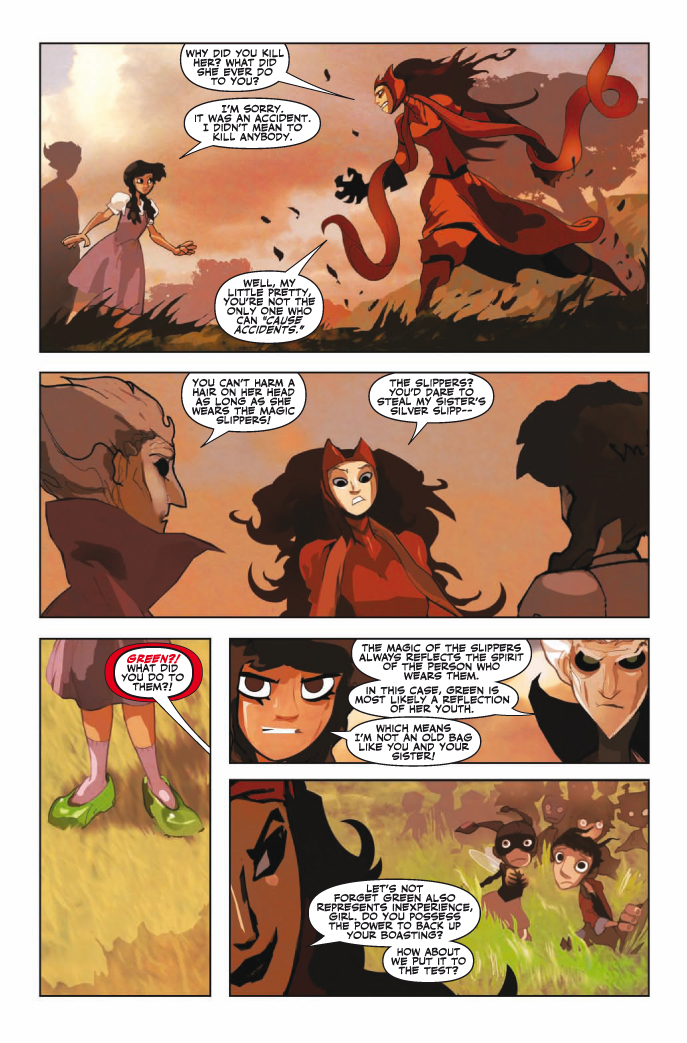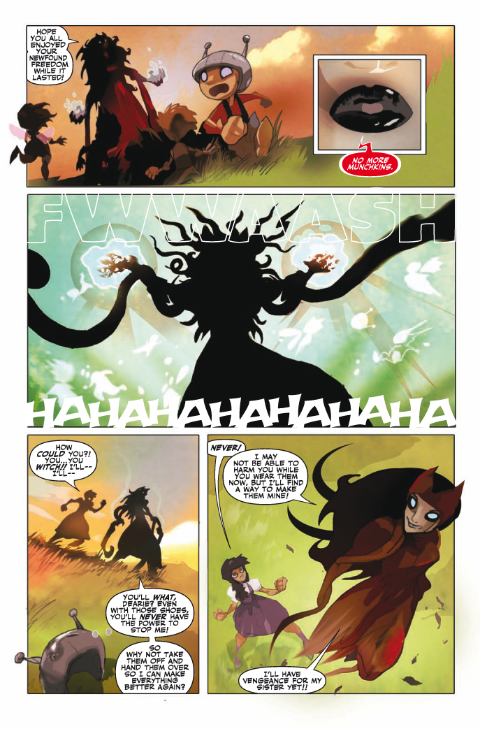 [ENGLISH] Marvel tells us: THE STORY: We’re not in the Marvel Universe anymore, Toto! When young Jennifer Walters is swept away and carried to the mysterious land Oz, she discovers that turning green is only the beginning of her troubles. But she follows the Rainbow Road and encounters a familiar cast of characters more in need of help than her; a rusty old Iron Man in need of a heart, a scarecrow whose lost his hammer and maybe his mind, and a brave old warrior who simply needs to find his courage. And just when they thought things couldn’t get any worse, the Scarlet Witch of the West arrives to utter three ominous words… « No More Munchkins!”