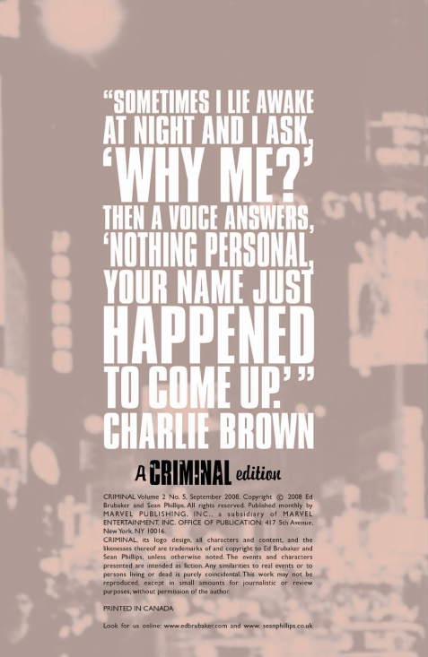 [ENGLISH] Marvel tells us: Nothing is what it seems when a woman on the run falls for a man running from his past! “Bad Night” Part 2 of 4, twists like a knife in your back, as the multiple-award-winning series CRIMINAL keeps the hits coming! Jacob K. is no stranger to trouble, or to the strangers that bring trouble with them. Still, his coincidental meeting with a beautiful woman in need of shelter is beginning to turn his life upside down, and he’s starting to wonder if he even cares. And he’s also wondering if there are really any coincidences in life. See what these bad nights will bring him, and if he’ll get out alive.