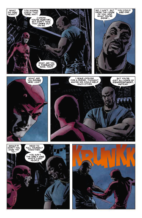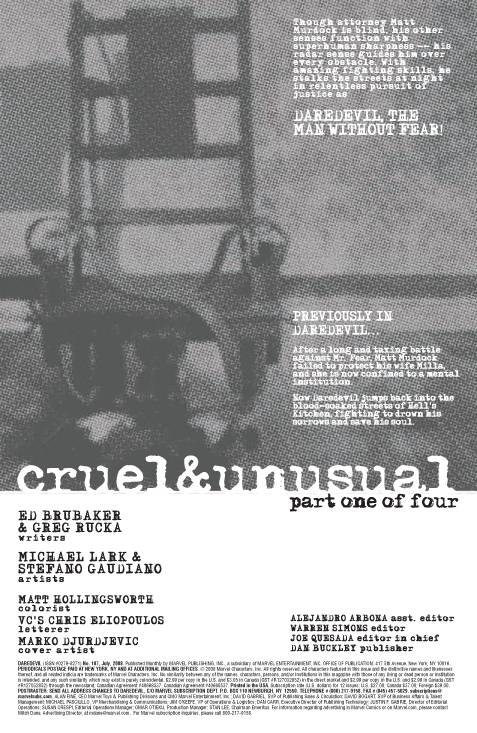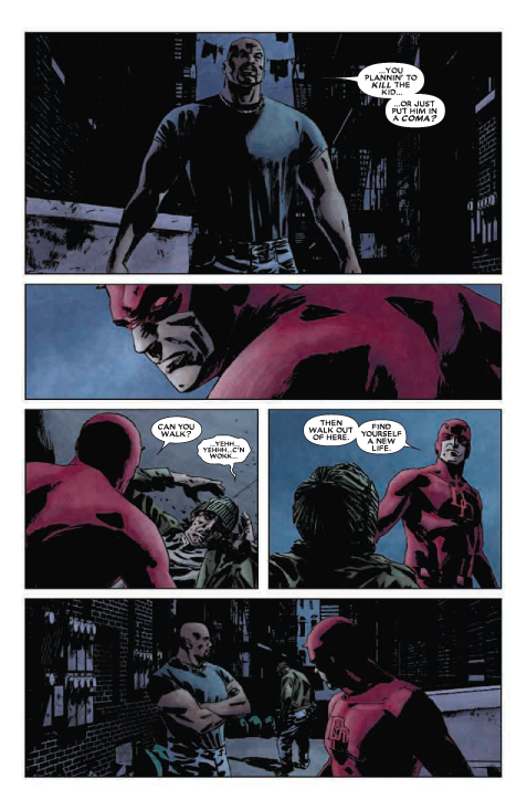 [ENGLISH] Marvel tells us: The story: Matt Murdock Takes A New Case! Still reeling from the conclusion of his battle with Mr. Fear, an old friend drags Matt Murdock back into the light of day by bringing him the last-minute appeal of a Marvel villain now sitting on DEATH ROW. What will Matt do, is the question, when confronted with a bad guy who is completely innocent of the crime he was convicted of? « OTHER PEOPLE’S PROBLEMS » Part One!