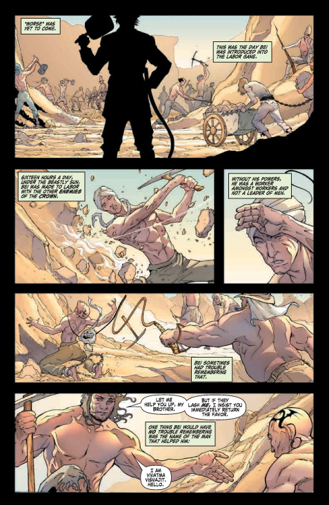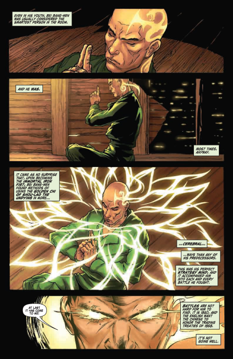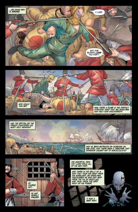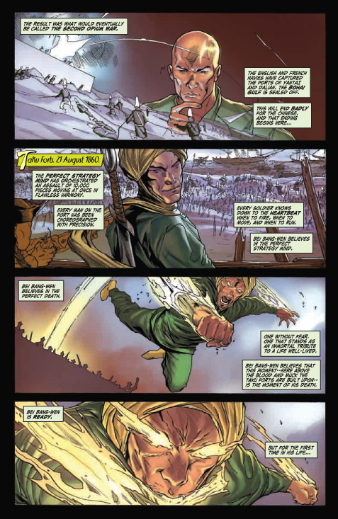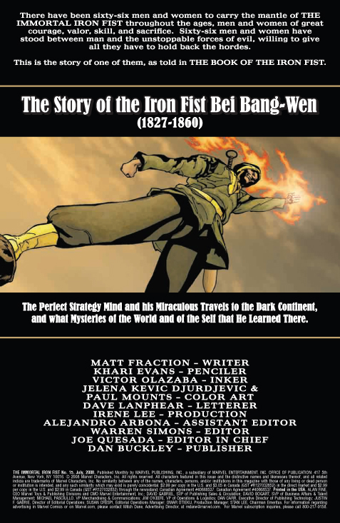 [ENGLISH] Marvel tells us: « the story: TALES OF THE IRON FIST! When we last saw Bei Bang-Wen, he was leaping to what seemed to be a certain death off the top of the Taku Forts — would you believe us if we told you that was only the beginning? Join us as we take a look at another one of the fabulous Iron Fists of years past and his legendary legacy in “The Story of the Iron Fist Bei Bang-Wen — The Perfect Strategy Mind and his Miraculous Travels to the Dark Continent, and What Mysteries of the World and of the Self that He Learned