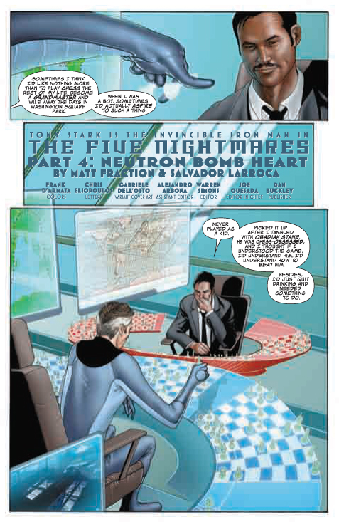 [ENGLISH] Marvel tells us: THE STORY: Iron Man and Zeke Stane have been dancing around one another like pieces on a chessboard, and it’s been all Tony Stark can do to hold on. After one of his closest allies is critically injured, Tony aims to put an end to the games with some serious upgrades. But while Iron Man readies himself, Zeke makes his most audacious assault yet, in an attack so stunning you have to see it to believe it. THE FIVE NIGHTMARES continues, and it only gets worse from here for THE INVINCIBLE IRON MAN. By Matt Fraction (UNCANNY X-MEN) and Salvador Larroca (AMAZING SPIDER-MAN).
