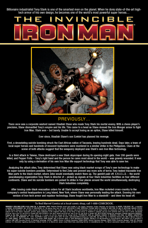 [ENGLISH] Marvel tells us: THE STORY: Has Tony Stark come face to face with his equal? His better…? Stark Industries is beset on all sides by the evil Ezekiel Stane and his hordes of suicide bombers around the world. Can Iron Man be in four places at once while his empire crumbles?