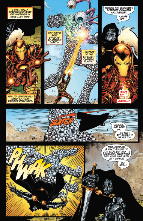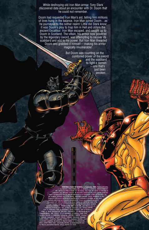 [ENGLISH] Marvel tells us: THE STORY: “Knightmare’s End” It all comes down to this! The true motive for Dr. Doom seeking Iron Man’s aid comes to light at last, revealing a threat unlike any the Armored Avenger has faced before. Tony Stark, now partnered with his most dangerous foe, wrestles with impossible choices, even questioning the beliefs that form the very core of his being. And the decisions he makes will determine the fate of every man, woman and child on Earth. The stunning conclusion to The Camelot Trilogy will rock your world–literally!