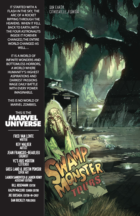 [ENGLISH] Marvel tells us: THE STORY: Board up Avengers Tower! Lock down the Baxter Building! The ravenous hordes of Marvel Zombies are invading … the Marvel Universe! That’s right, the next chapter of the MZ saga is a non-stop in-continuity gorefest with major implications for at least one Marvel hero! When the super-undead stumble into the MU from the Man-Thing’s Nexus of All Realities, all of Florida is quarantined against the zombie plague. Time is quickly running out for a cure, so the Initiative sends a most unlikely group of heroes into the Zombieverse on a desperate mission to find the one item they need before the whole MU is consumed! The scream team of Fred Van Lente (INCREDIBLE HERCULES) and Kev Walker (ANNIHILATION: NOVA) unite for a Marvel Zombies story like you’ve never seen before!
