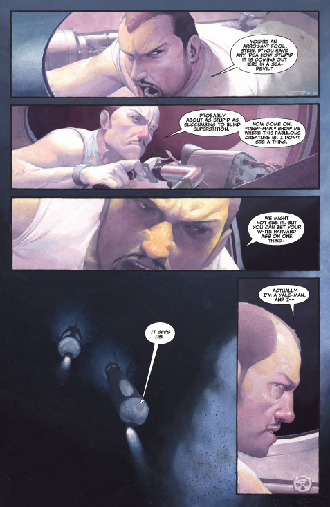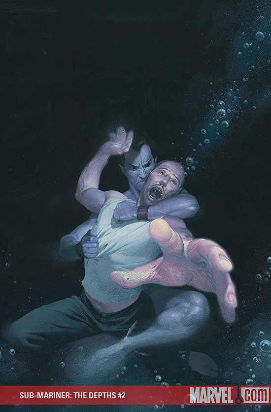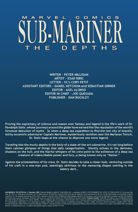 [ENGLISH] Marvel tells us: THE STORY: The latest offering from the red-hot Marvel Knights line offers a searing vision of Namor, the Sub-Mariner as you’ve never seen, brought to you by Peter Milligan (X-Force) and Esad Ribic (Silver Surfer: Requiem)! Atlantis. Throughout the ages, a few men have wondered if this fabulous place actually exists. Fewer have imagined that the city is protected by a wild and vengeful being, the very embodiment of the untameable depths themselves — the Sub-Mariner. When a legendary adventurer named Randolph Stein travel deep into the dark belly of the Marianes trench in search of a missing deep sea expedition, he is about to encounter things that supersede his wildest imagination. There is something down there in the murky depths — something far closer to God than man — and it has been waiting for Stein for a long, long time.