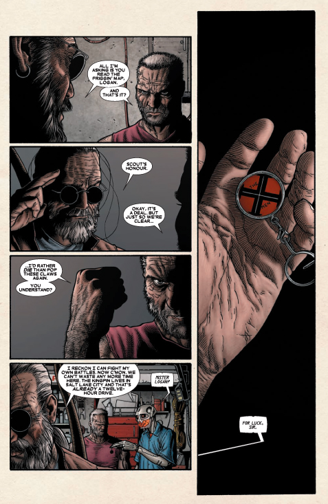 [ENGLISH] Marvel tells us: THE STORY: “OLD MAN LOGAN” – 50 years after the super heroes died, WOLVERINE and the blind archer, HAWKEYE, continue their journey across a ruined America. Next stop: Cedar City, Utah—home of the man who killed Magneto: the all-new, all-different KINGPIN! And he isn’t about to let Logan and Hawkeye pass without paying the toll… Plus: the secret of Hawkeye’s daughter is revealed! The biggest WOLVERINE story of the century by the best-selling creative team of the millennium continues! PART 3 (of 8).