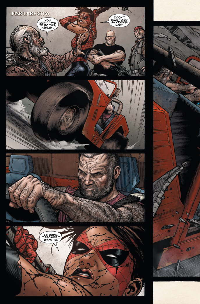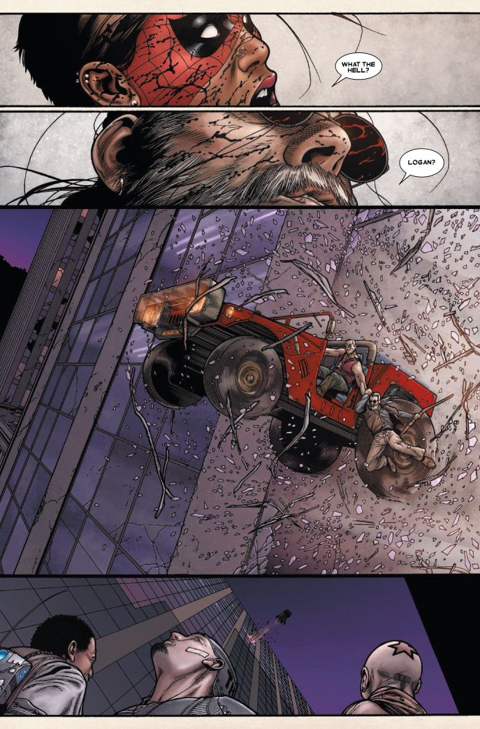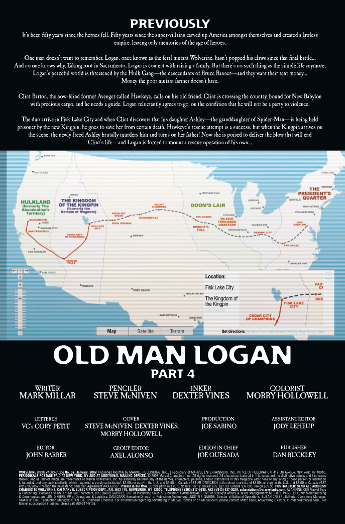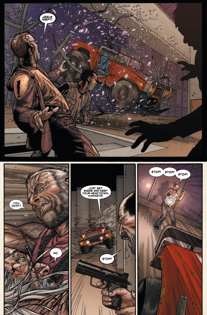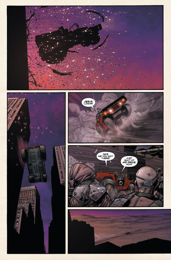 [ENGLISH] Marvel tells us: THE STORY: In a decimated future where America is dominated by super-villains, old man Logan lives out his days, but as far as he’s concerned, WOLVERINE died fifty years ago with the rest of the super heroes. Now he’s on a cross-country journey with the blind archer HAWKEYE to deliver a secret package to Hawkeye’s contacts on the east coast. But dinosaurs and earthquakes might just finish them off for good! Plus: the identity of the PRESIDENT is revealed! MARK MILLAR and STEVE MCNIVEN continue their post-apocalyptic epic for the ages! Part 4 (of 8).