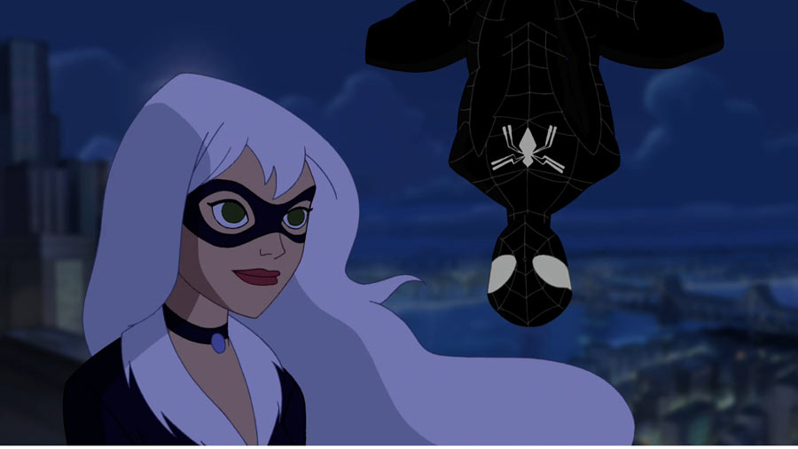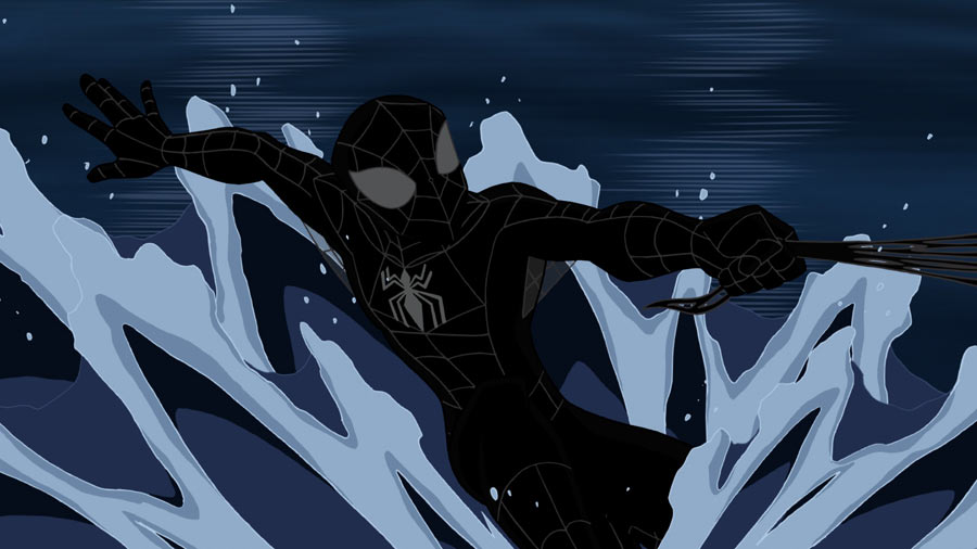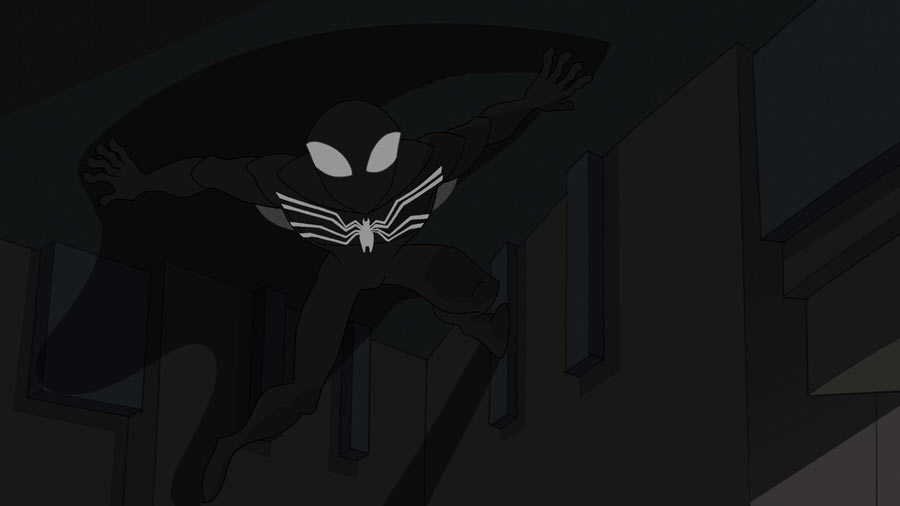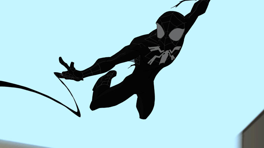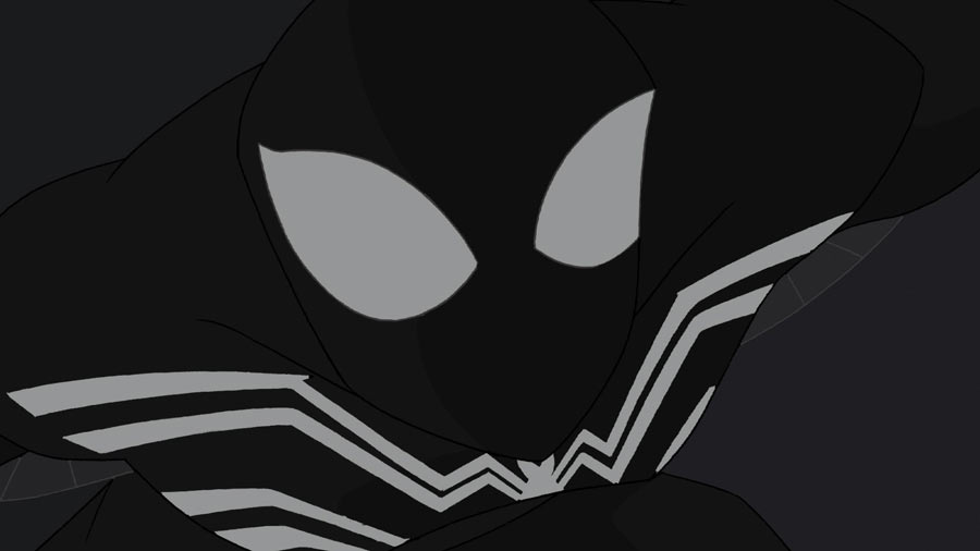 Producer/Supervising Director Victor Cook explained the reason for the evolution of the black suit from episode to episode. »The symbiote’s control over Peter isn’t sudden, it progresses – and we wanted to show that aspect visually as well by having the black suit progress from classic web pattern to non webs, » Cook said. « As the web unravels, so does Peter’s control. Also, it was fun to for us to homage both the movie and comics versions of the black Spidey suit. »