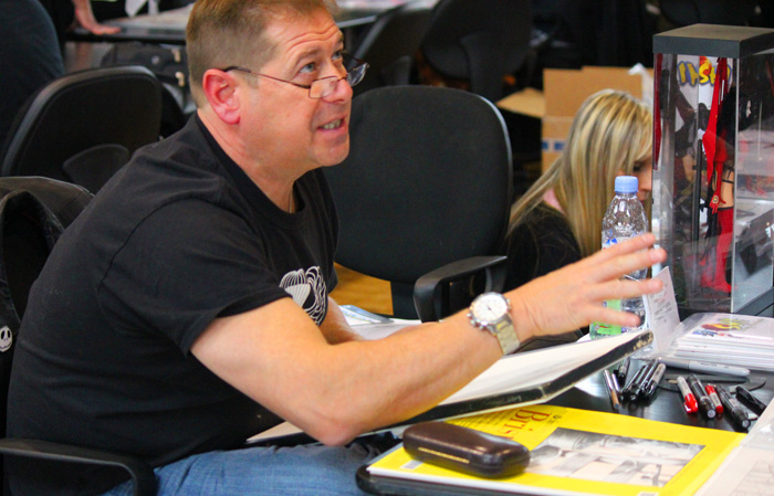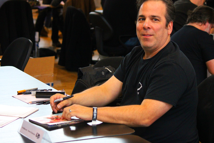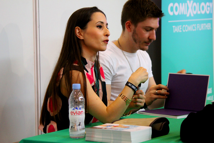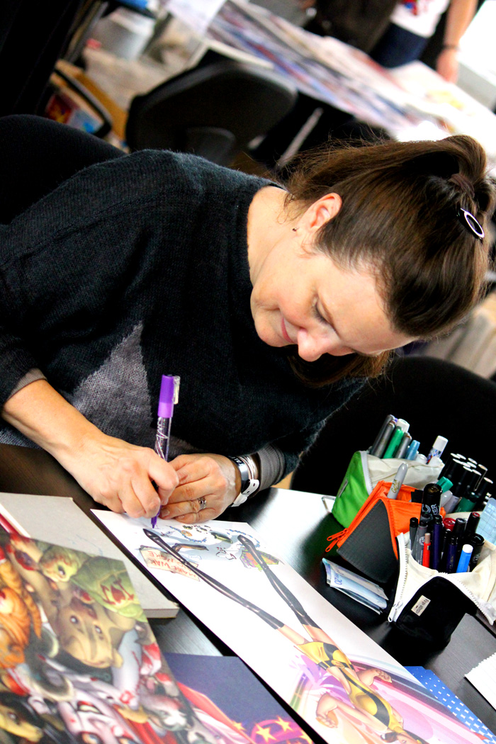 Première constatation, le cadre du Parc de la Villette change une bonne partie de la donne, par rapport aux halls de Villepinte. En compactant les choses mais aussi en les organisant autrement, Reed récupère un sens de circulation plus animé. Là où, dans les Comic Con qui ont précédé, le « village comics » peinait à trouver son identité, avec les auteurs en dédicaces d’un côté et de l’autre les boutiques, sans qu’il y ait réellement interaction entre les deux, l’artist alley est organisée ici en petites zones latérales. Ce qui fait que, bien sûr, au début, il faut trouver ses marques (quand on vous dit que tel artiste est dans l’artist alley, encore faut-il savoir dans laquelle des zones). Par contre l’avantage c’est que – en dehors de la dédicace de Frank Miller, véritablement prise d’assaut, qui a fait l’objet d’un traitement bien particulier mais c’est compréhensible vue la demande – l’essentiel des scénaristes et dessinateurs restaient très abordables. On pouvait discuter assez facilement avec des gens comme Jimmy Palmiotti, Amanda Conner, Bill Tucci et d’autres encore… A noter aussi une « barre » Star Wars avec des gens comme Davide Fabbri, Stéphane Roux, Julien Hugonnard-Bert… C’était un peu plus formel – disons plus « classique » – du côté des dédicaces des stands de Comixology ou Glénat mais Kelly Sue Deconnick (alternant avec Matt Fraction, Elsa Charretier, Pierrick Colinet, Geoff Darrow) distribuait des hugs à volonté à son public.