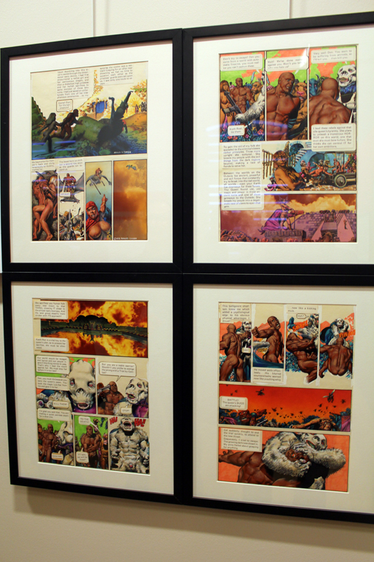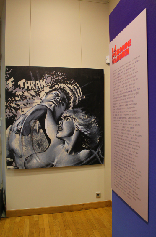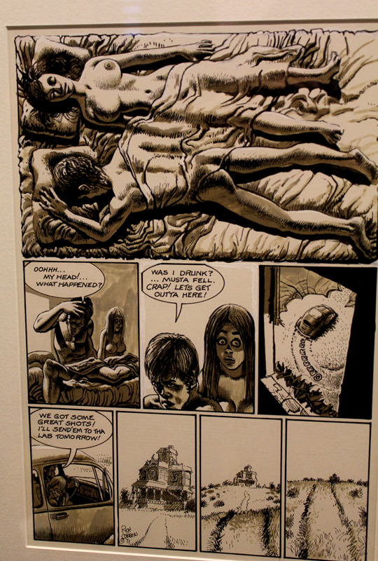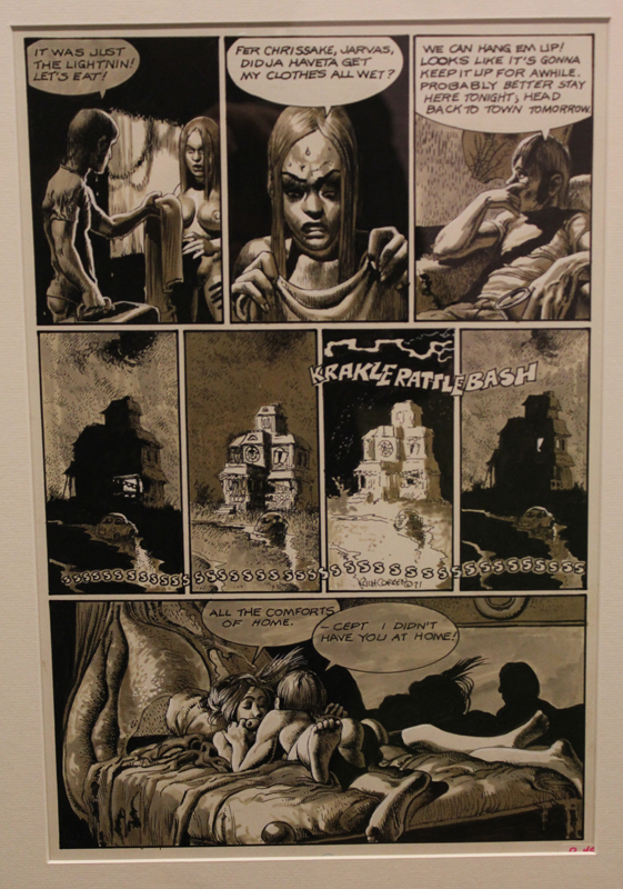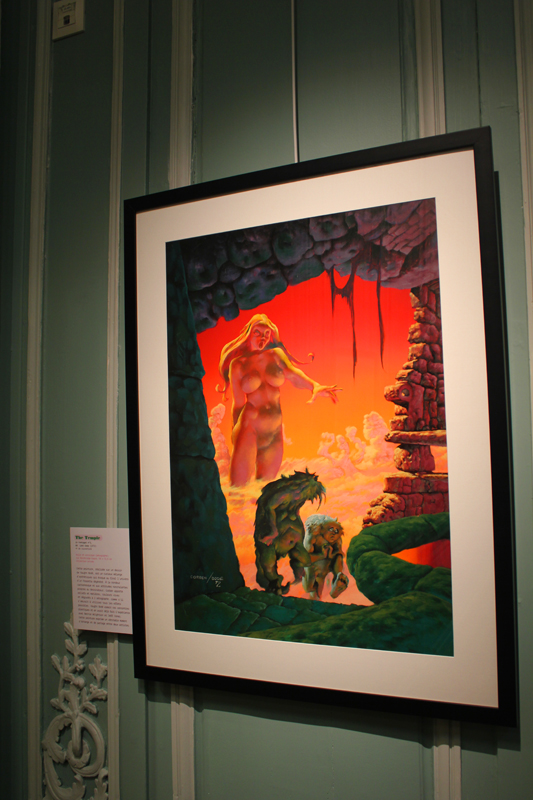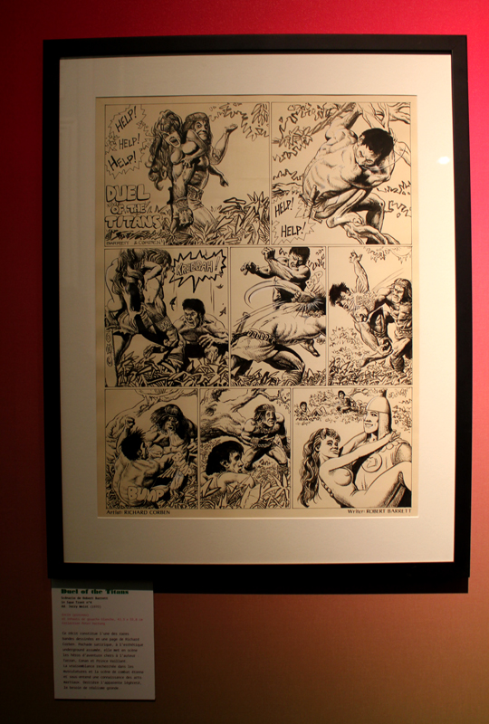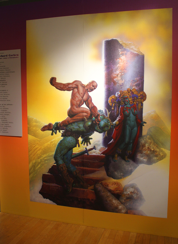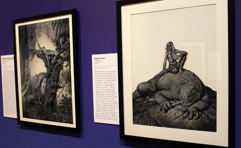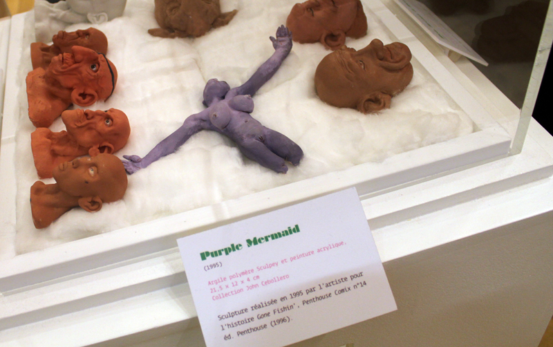 Exposer Corben au musée, cela faisait donc doublement sens ce week-end. Car si la nudité est omniprésente dans les premières décennies du travail du maître, ce n’est pas pour autant que cela veut dire pornographie, comme certains voulaient l’y réduire l’an dernier. Pour preuve un public familial, certes parfois un peu sidéré de découvrir cet univers si particulier. Mais pas forcément choqué. Pour preuve quelques enfants venus avec leurs parents, enfants qui accordaient bien peu d’attention aux monstres et aux pinups mais s’amusaient du côté grotesque de la chose. Bien pensée, l’exposition expliquait en effet de façon très pédagogique le parcours de l’auteur. Elle ménageait aussi une dimension multimédia avec les films d’animations que Corben a pu créer à ses débuts ou encore des statuettes modelées par l’artiste pour lui servir de modèle. Les gamins adoraient cet aspect ludique. Et puis réduire Corben « aux muscles et aux tétons » serait amputer toute une partie de sa carrière de maître du fantastique, avec des visions de vampires, de gorilles ailés, de dinosaures ou encore ses adaptations des romans de Poe. A l’inverse, ceux qui connaissaient, qui avaient pu passer de longue date ses pages, ses couvertures (ses « années Métal » comme expliqué dans l’exposition) avaient de quoi rester bouche-bée devant des originaux devenus depuis des décennies des classiques.