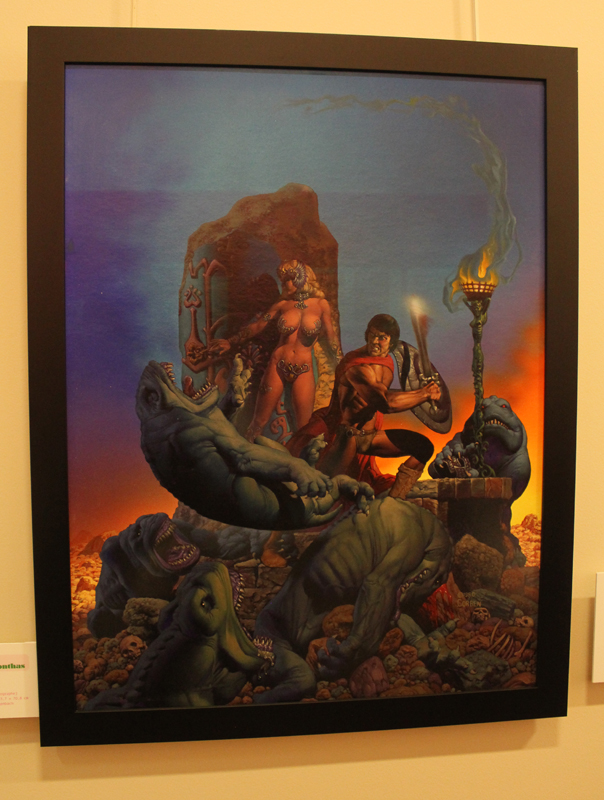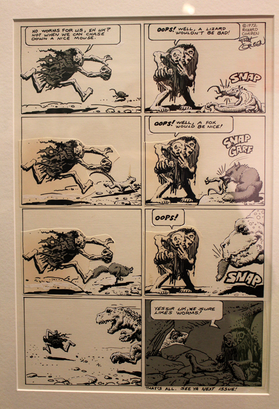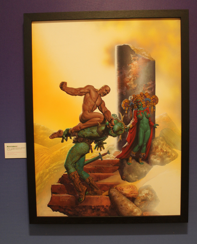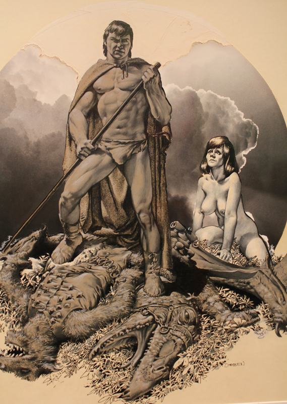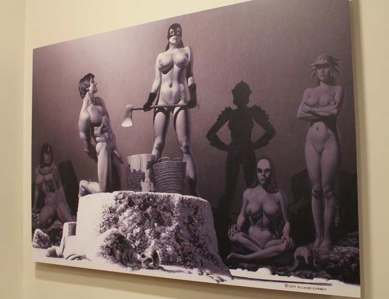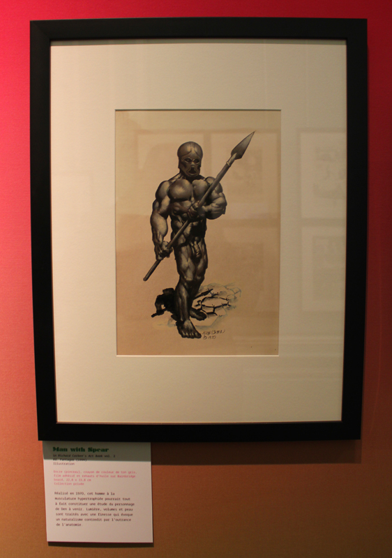 Un objet n’est rien sans son contexte, disions-nous, et comme pour mieux nous le rappeler, le Musée de la ville d’Angoulême était ce week-end un écrin idéal. Il fallait en effet d’abord traverser un rez-de-chaussée habité par des squelettes d’animaux préhistoriques avant de grimper trois étages et découvrir un autre monstre sacré. Richard Corben du début à nos jours, pour ainsi dire… Muscles gonflés et poitrines opulentes ? Oui, mais pas seulement. Et quand bien même, les premières pièces de l’exposition démontraient très bien, à travers quelques tableaux de jeunesse, que Corben en matière d’étude de nu n’a rien à envier aux grands maîtres de la peinture. Corben explose réellement dans les années 70, en pleine libération sexuelle, quand il s’agit de tourner le dos à des décennies de conservatisme, à revendiquer l’usage de son corps. Il créé des hommes forts mais aussi certaines femmes rebondies qui n’en sont pas moins de fortes têtes. Tout est exagéré, un peu comme si Michel-Ange s’était amusé à représenter Conan le Barbare. Mais cette fascination pour le corps, elle ne s’exerce pas sans un certain recul, une forme de caricature qui fait que l’artiste représente, dans le même temps la difformité et bien souvent des êtres hallucinés, médusés, qui auraient leur place dans le film Freaks.