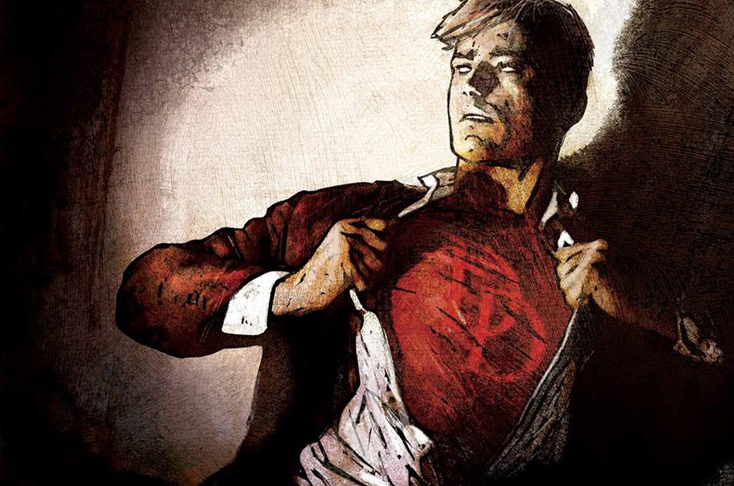 Mais qu’est-il donc ce Moi, lorsque n’étant plus cette lourde accumulation de déguisements sociaux-professionnels, il n’est pas encore cette force surhumaine transcendante ? Et qu’a-t-il donc de si important cet infime laps de temps transitoire, qu’il faille ainsi le souligner, s’y arrêter, le fixer comme un instant d’éternité ? C’est une illustration de J. H. Williams III qui, semble-t-il, colle au plus près du sens profond de ce motif iconique. Peignant Clark Kent ouvrant les deux pans de sa chemise, sa cravate déjà défaite et soumise au geste et au vent, le dessinateur choisit de montrer le personnage en noir et blanc et à contre-jour (le visage n’est qu’une ombre sans détail), réservant les seules couleurs au célèbre « S » de Krypton sur le fond bleu du collant. Clark Kent n’est presque plus là et Superman pas encore.