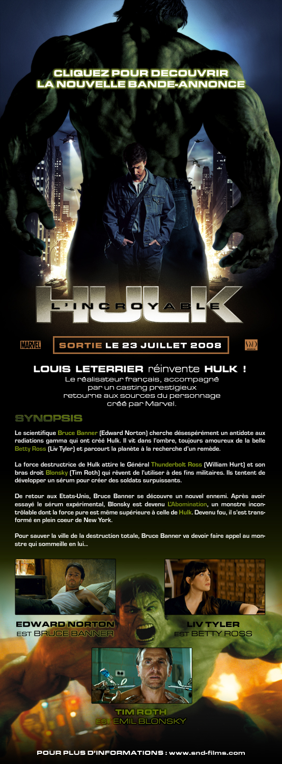 [FRENCH] Est-ce que Hulk va tout casser ? Allez savoir… Personne chez nous n’a encore vu l’Incroyable Hulk (le film de Louis Letterrier prévu pour le 23 juillet prochain) mais il est certains que les premières critiques américaines ont l’air d’apprécier et de renvoyer la version d’Ang Lee dans les cordes (ce qui est quand même un minimum). Du côté français, les responsables de SND s’activent avec la sortie officielle de la bande-annonce en sous-titrage VF. Et voici d’ailleurs le carton de présentation du film, avec le synopsis…