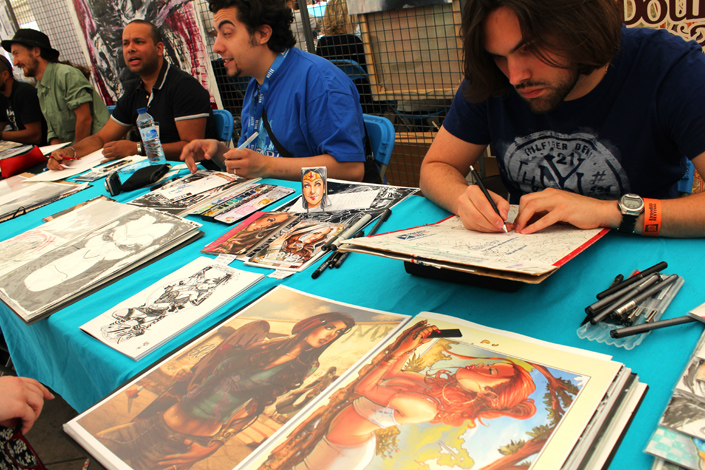 [FRENCH] Le Comic’Gone est terminé, mais il nous reste quelques photos à vous montrer de cette manifestation lyonnaise chaleureuse et conviviale, le deuxième et dernier jour ayant été occupé par encore plus de dédicaces, de cosplay, d’interventions et de discussions de tous ordres. D’Eduardo Rizzo à Will Simpson en passant par Yldiray Cinar, les dessinateurs présents se seront tous montrés d’une grande gentillesse. Côté « artist alley » aussi la disponibilité était de rigueur, certains dessinateurs relevant même le défi de glisser les personnages les plus biscornus dans des sketchcards. A noter qu’à côté du Comic’Gone à proprement parler, la manifestation-mère, Lyon BD, profitait également d’une « vedette américaine » de poids en la personne de Craig Thompson (accueilli, lui, du côté du Palais du Commerce). On n’aura croisé que quelques cosplayeurs ce dimanche mais, que ce soit Shazam, Poison Ivy, Venom, la Fille du Joker ou Two-Face, il y en avait assez pour organiser un concours. Avec la météo qui était, clairement, du côté du festival, le Comic’Gone 2014 s’est donc bien déroulé et… notre petit doigt nous a dit qu’une édition 2015 et d’ores et déjà validée…