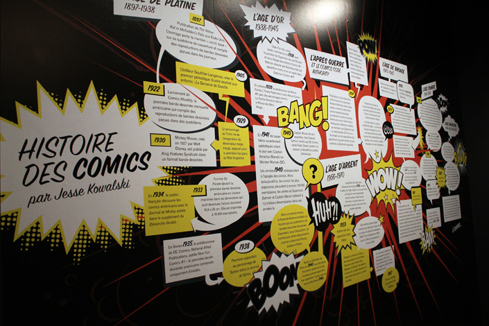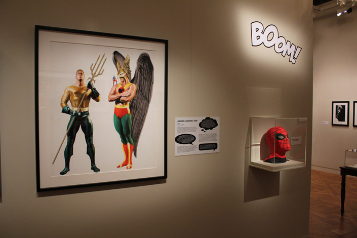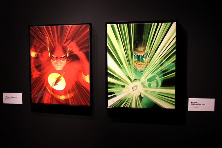 Car, oui, quand on est lecteur de comics on s’engage dans ces salles avec le sentiment d’être en terrain connu. Normal : le commissaire (non, pas Gordon !) de l’exposition, Jesse Kowalski (qui était présent ce matin au Mona Bismarck American Center) a veillé à ne laisse personne à côté de la plaque. Dès le début on ainsi droit à un véritable mur d’orientation qui explique aux néophytes et aux plus jeunes comment s’organise la chronologie des comics (Golden Age, Silver Age…). Une mise au point qui se révèle vite stratégique puisqu’il s’avère qu’il faut expliquer au public qu’Alex Ross prend un plaisir certain à représenter les super-héros dans leur forme la plus iconique. Tel que l’explique lui-même Jesse Kowalski : « Alex Ross refuse de dessiner le Superman moderne qui porte son slip sous ses collants ! ». Non, le Normal Rockwell des comics vise le vintage, l’intemporel, l’indémodable, l’impression de puissance…