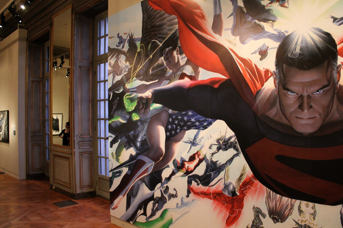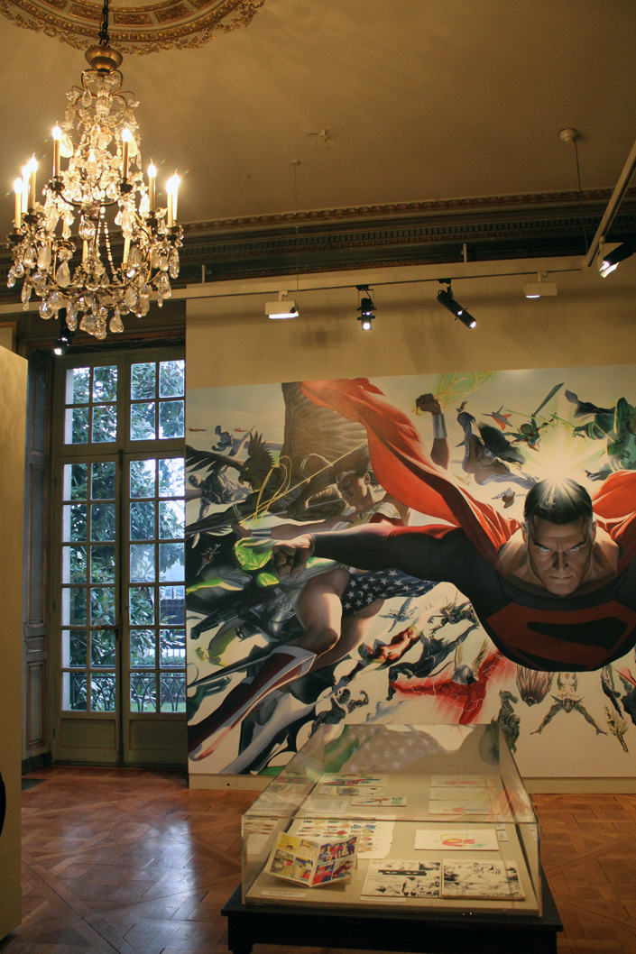 Le cadre du Mona Bismarck American Center se prête assez bien à cette exposition, avec un contraste parfois assez baroque entre les œuvres, les murs, les cheminées et les chandeliers. Mais ça fonctionne tout à fait. Les illustrations d’Alex Ross sont à leur place dans cette ambiance de musée. S’il est vrai que la sélection des images laisse la part belle aux icones de DC Comics, il y a un petit quelque chose qui fait qu’en voyant le portrait de famille des Avengers installé au dessus de la cheminée on se croirait presque dans la Stark Mansion. Ne manquerait guère que Jarvis ! L’expo en elle-même occupe trois pièces, une quatrième (la dernière) se préparant à accueillir des activités pédagogiques sur le thème des super-héros. Jusqu’en juin, l’endroit accueillera aussi diverses conférences ou démonstrations de dessin (ces dernières étant organisées avec le concours du Comicverse). Bref, un petit passage s’impose pour tout fan d’Alex Ross qui se respecte…