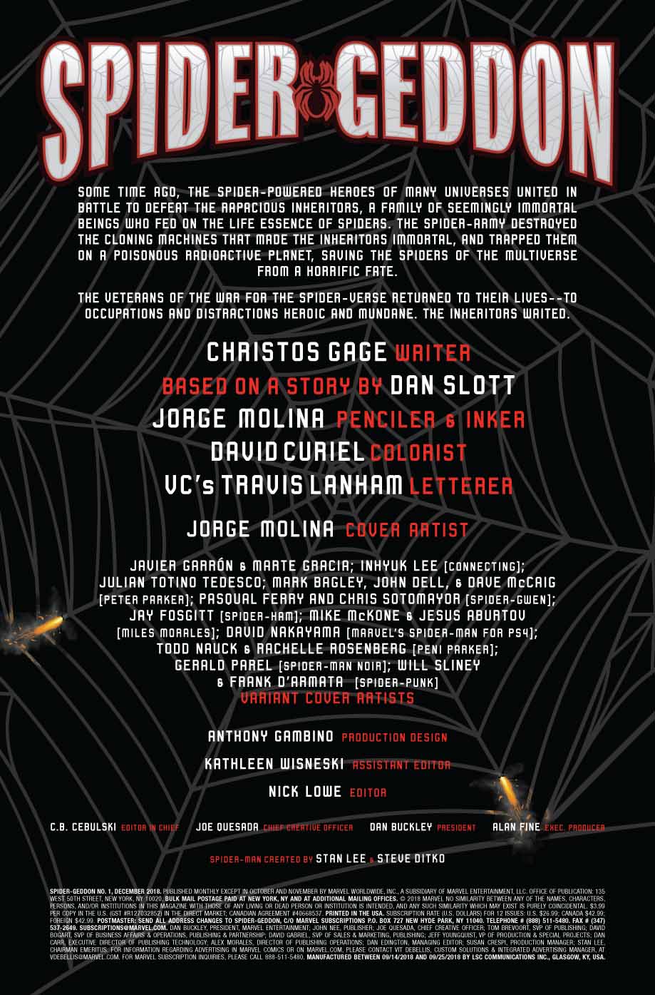 8 octobre 2018Back in 2014, Spider-Verse brought every Spider-Man ever together. This event spinning out of Amazing Spider-Man #800 has Christos Gage and Dan Slott teaming up to destroy them all. The Inheritors have somehow gotten out of their radioactive prison planet and made their way to the Marvel Universe. It’s going to take a whole Spider-Army to keep them from taking it all! Starring Spider-Man, Doctor Octopus, Spider-Gwen, Miles Morales, Spider-Woman, the Spider-Man from the anticipated video game and, well, every Spider-Man and Spider-Woman ever, including some brand-new ones!